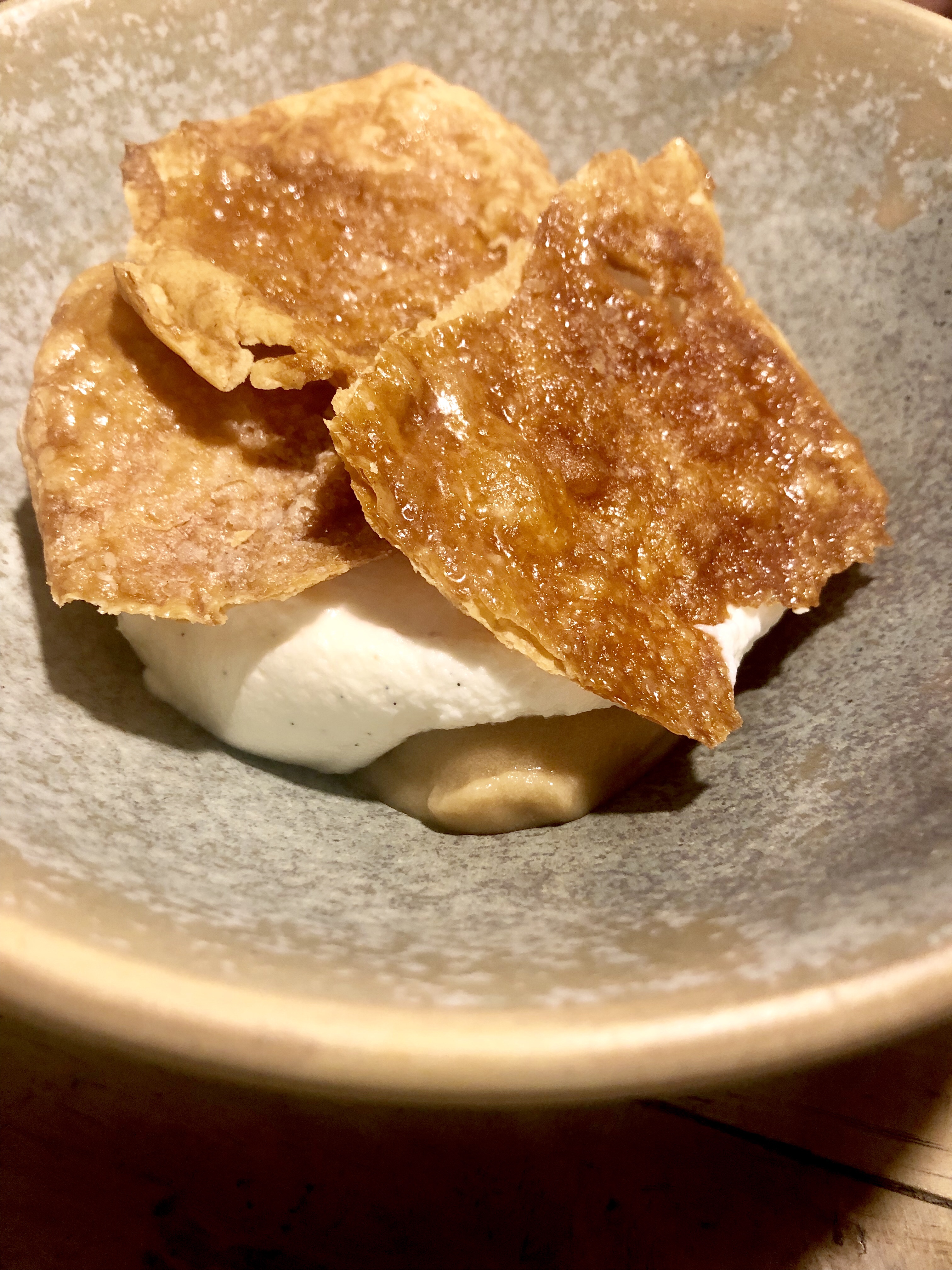 También me gusta mucho el helado de manzana asada -qué original, denso y goloso es un helado de manzana asada– con algo de nata batida y una espléndida corona de obleas de hojaldre. Estupendo.