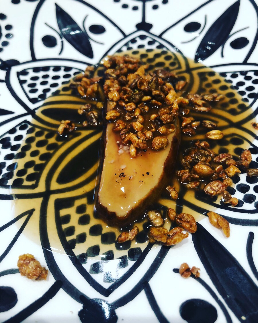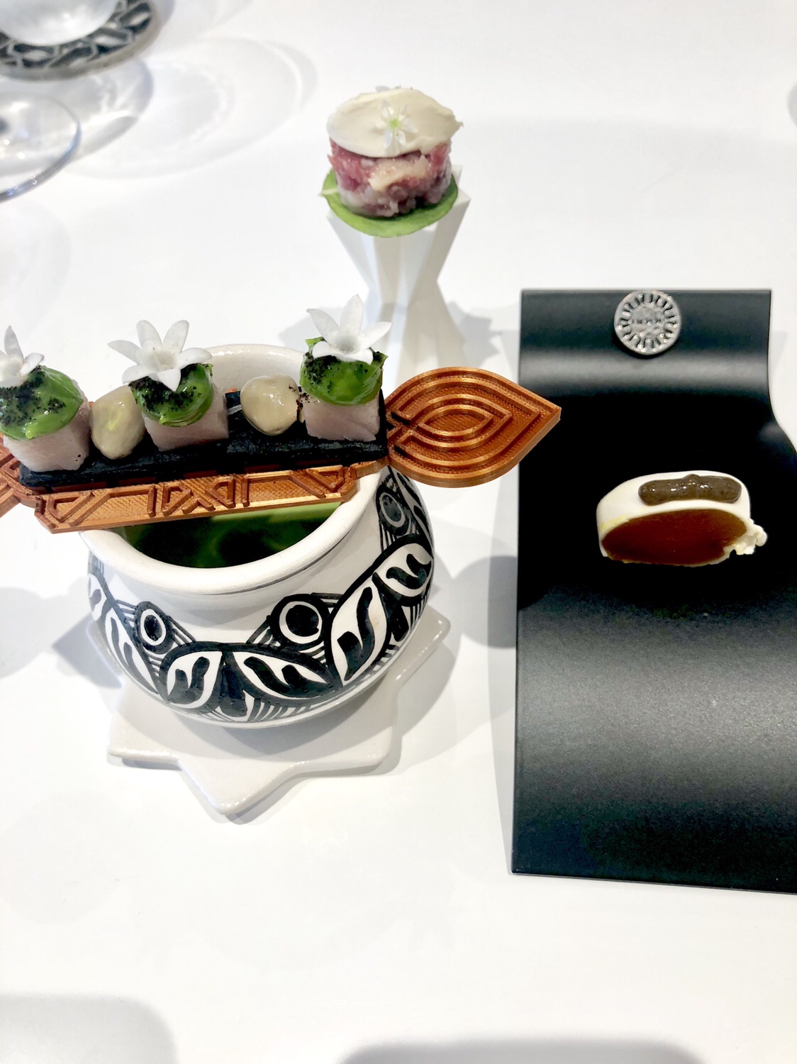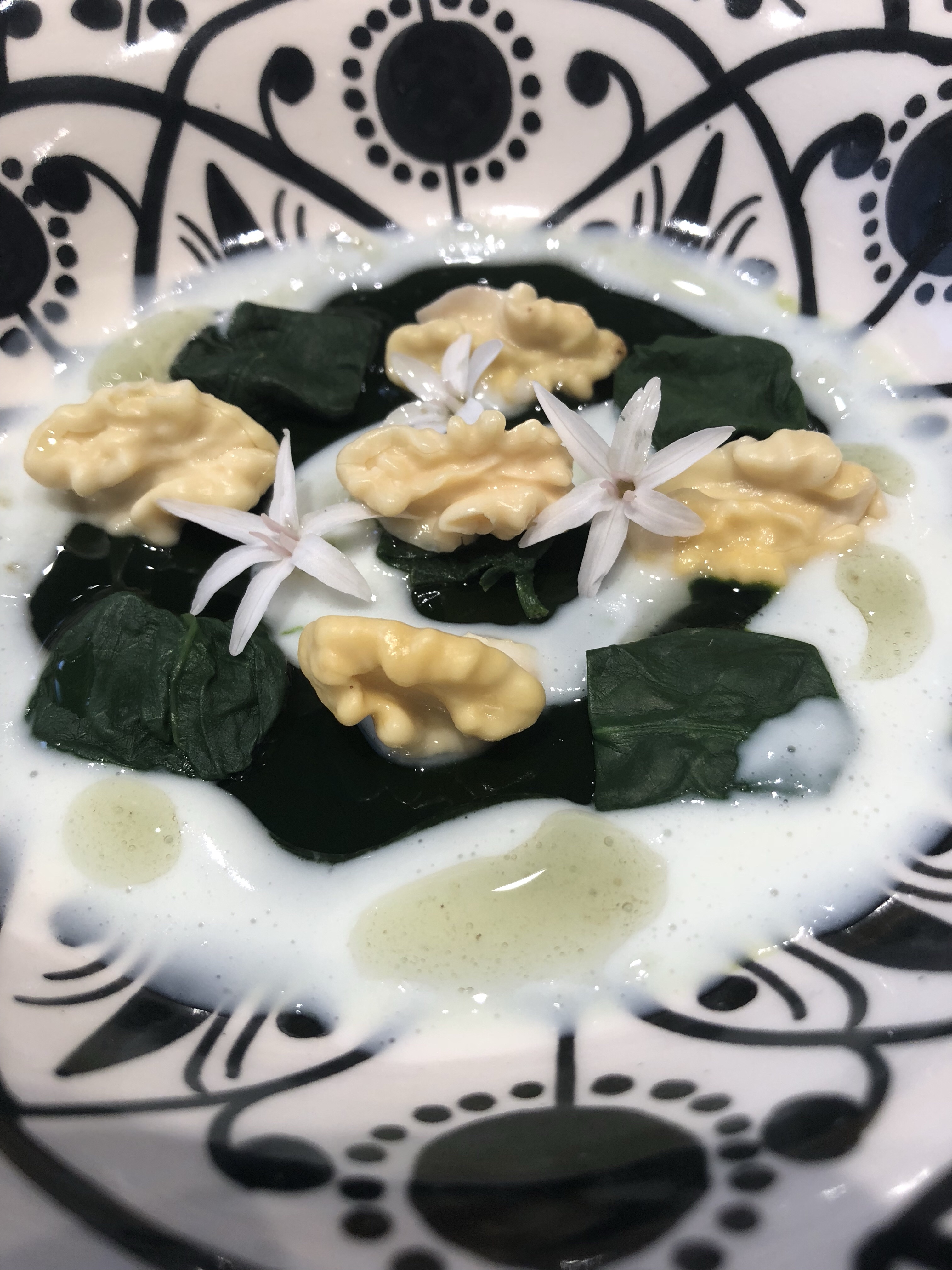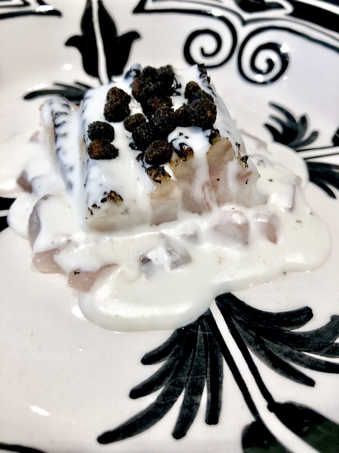 Y llegan los dos últimos aperitivos, juntos. Hace bien porque uno es una novedad y da un poco de miedo: es el buñuelo de gallo, ajo negro y menta que si asusta es por ser de cresta de gallo. Pero miedo injustificado porque es una delicia de intenso sabor. Hay cresta pero en forma de sabor porque el relleno es líquido y picante. La textura más crujiente que la del buñuelo al uso. Entre eso y croqueta.