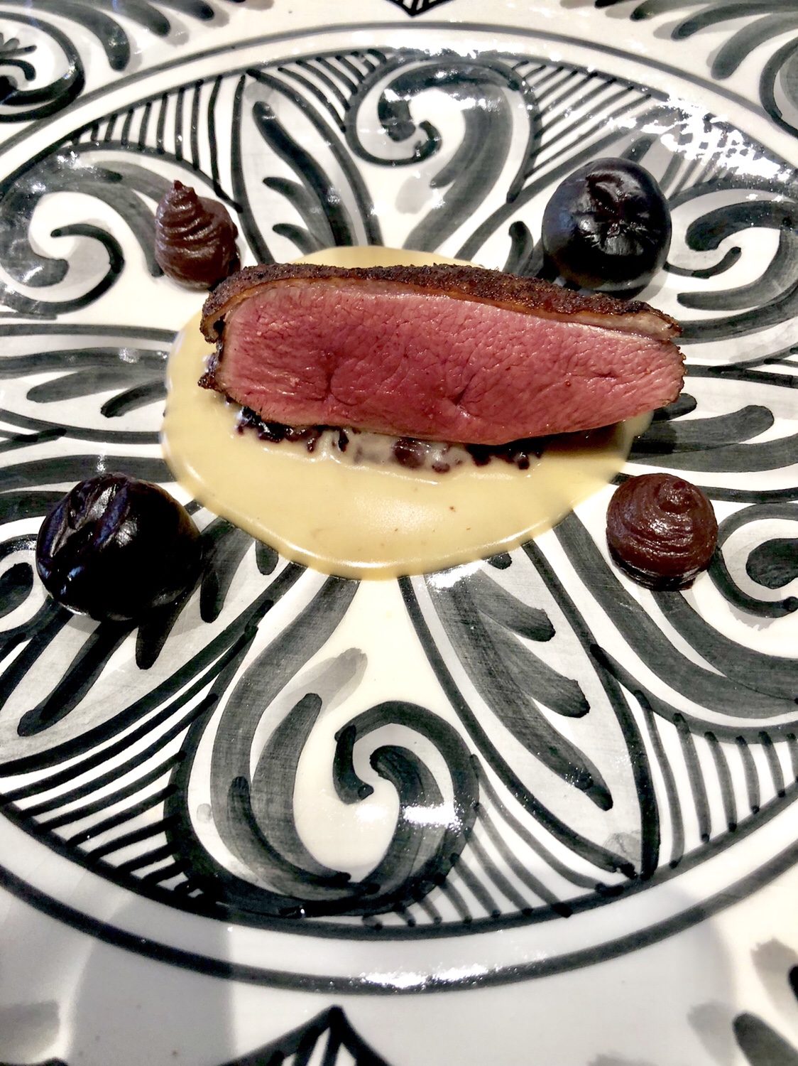 Estoy muy harto de tanto pichón pero he de reconocer que este de Roncero me encanta. Tierno, jugoso y con un punto perfecto, lo que no es fácil porque muchos parecen creer que es crudo. Lleva, para darle alegria, una espléndida crema de chocolate, setas y foie y, por si fuera poco, un buñuelo semilíquido de los interiores y un pedazo de brioche con mantequilla, que es por cierto, el único pan de la refección. Me encanta poner el buñuelo sobre él y llenar la boca de caza y campo con un solo bocado.