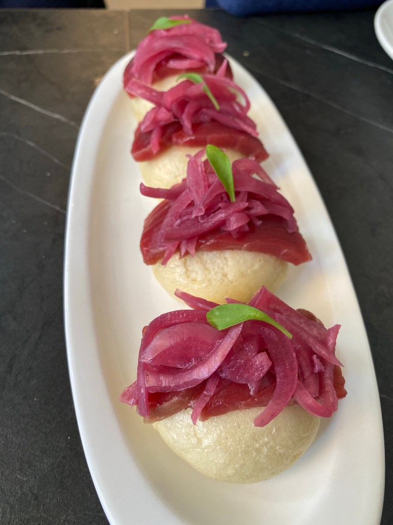 Pero como eso era algo muy sencillo, se lucen ahora con un clásico del chef: el sabroso y mullido pan al vapor con atún y cebolla roja. Simplemente así estaría estupendo, pero es un bocado con sorpresa porque el panecillo está relleno de una mayonesa de kimchi levemente picante y llena de aroma, todo un estallido de sabor.