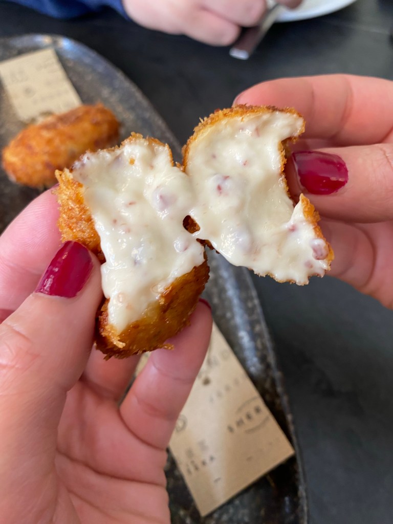 Tampoco es fácil parar con esas croquetas semilíquidas de bechamel fluida y aterciopelada, buenos tropezones de jamón y una cobertura recia y muy crujiente.