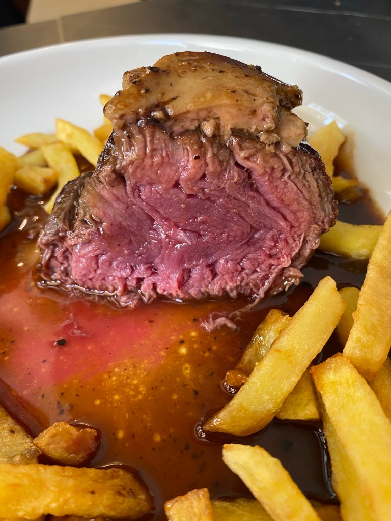 Muy buena en su género pero donde esté un tierno tournedo Rossini con su envolvente foie y su densa e intensa demi glace de Madeira, que se quite todo lo demás. El punto es perfecto, rosado y jugoso, y si además se populariza, como aquí, rodeándolo de doradas patatas fritas, pues “miel sobre hojuelas”.