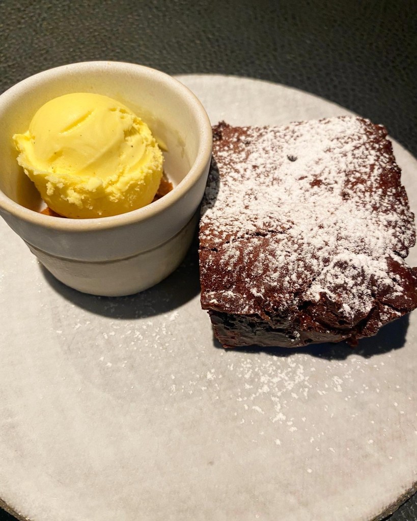 Con los postres se vuelve a los gustos más comunes y generalizados porque, como en el caso de la entradas, muchos de los que nos gustan pueden ser perfectamente aptos para veganos: me ha parecido exquisita la tarta de chocolate negro de intenso y delicioso sabor. La consistencia de la crema es estupenda y se anima con pedacitos de chocolate que aportan notas crujientes. La base es de brownie y aún lleva unos cuantos frutos rojos