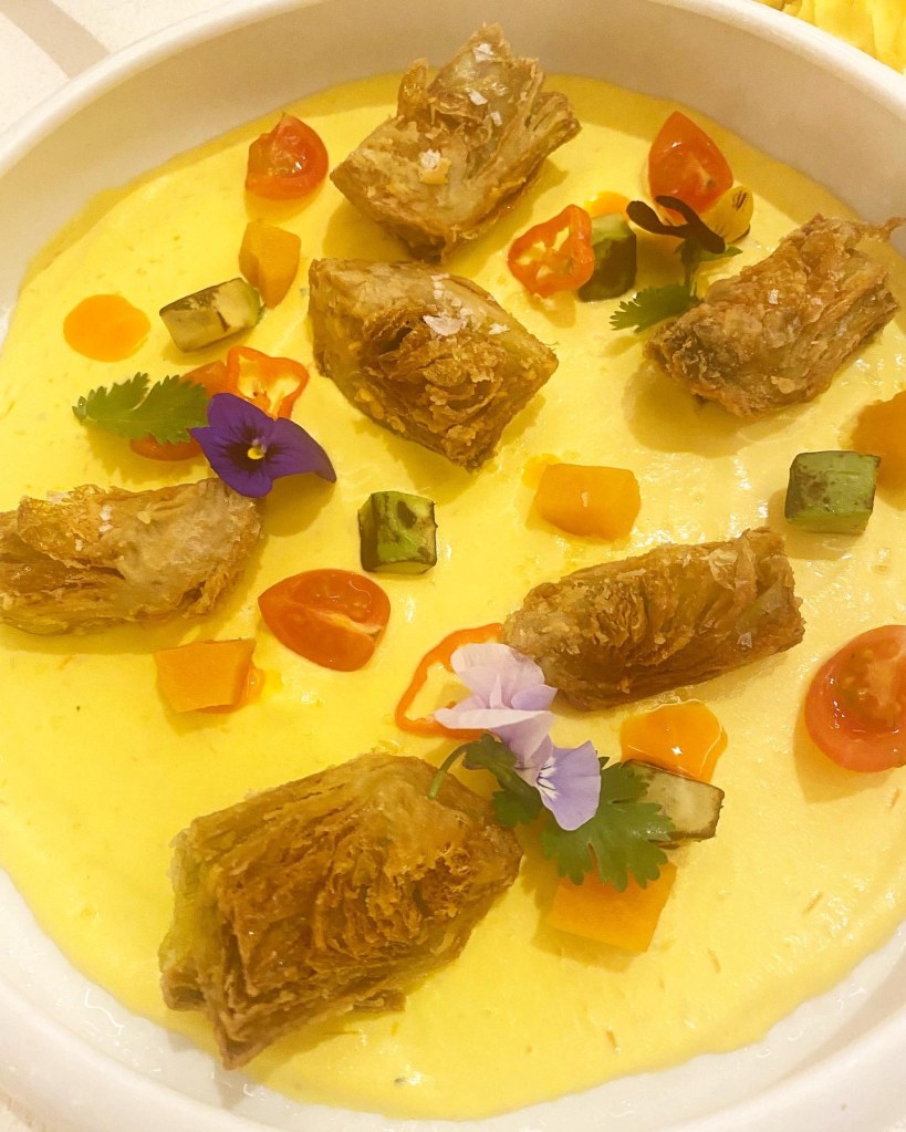 Pero para maravilloso picante, el del ají limo con pimentón picante que domina espléndidamente el tiradito de alcachofas, fritas y crujientes después de confitadas con ají amarillo y almendras. Además, tomatitos cherry, batata y aguacate asado.