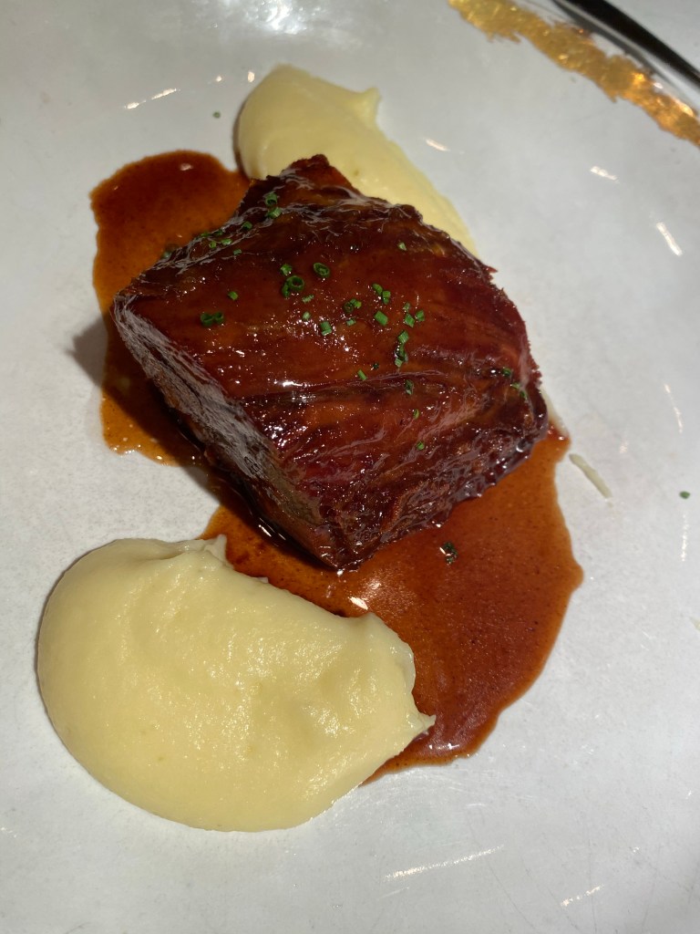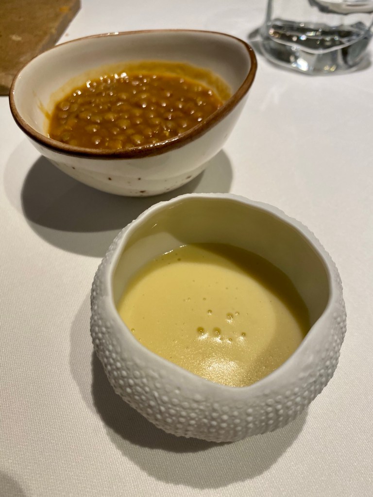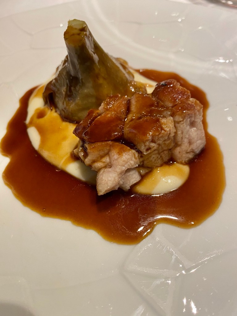La esencia de bogavante gallego es un caldo profundo que parece contener el alma del bogavante además de su cuerpo mortal. No necesita nada más pero lo rematan con hinojo marino encurtido, aceite de eneldo y aceite de ajo y jengibre, quizá demasiados aceites porque es resultado es algo más graso de lo deseable. Ayudan a rebajar, unos ricos ñoquis en plan glutinoso y japonés.
