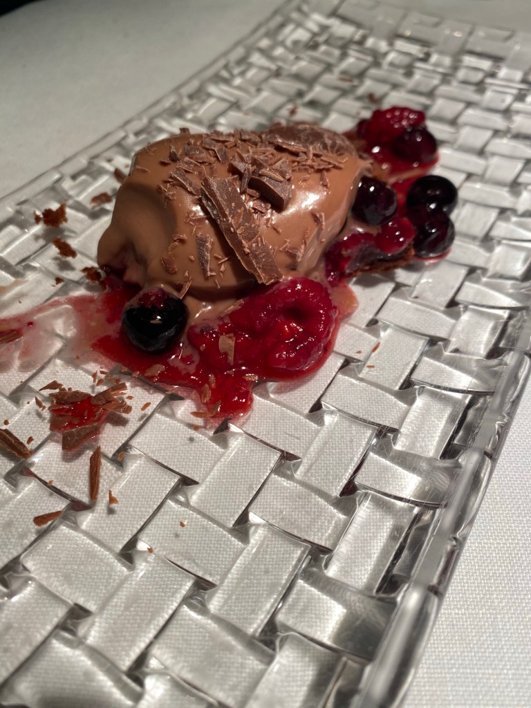 Se acaba con sudachi (limón japonés), sésamo negro, wasabi fresco, bizcocho de espinacas, helado de cereza negra y cremoso de lo mismo. Si no puedes lucirte con la repostería, vete a la originalidad del postre que es el gran travieso de la alta cocina española…