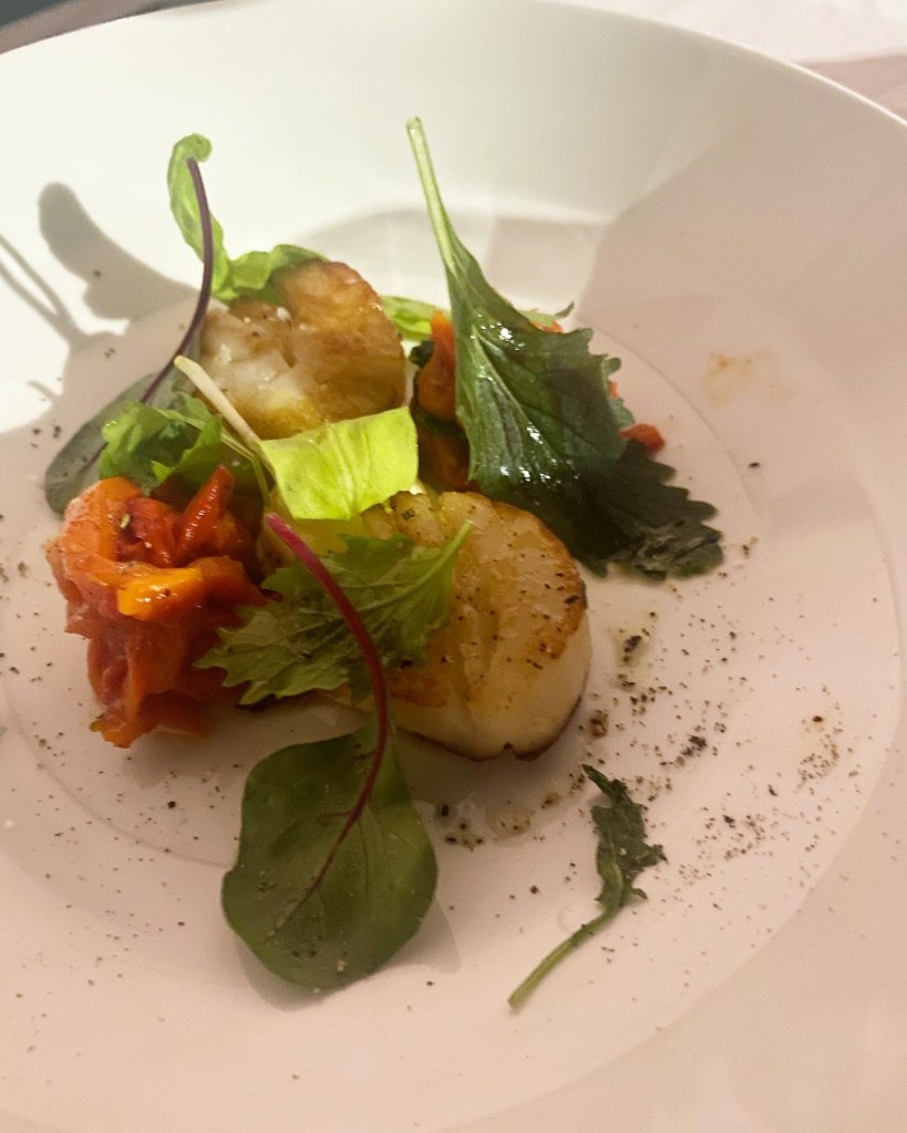 De vuelta en el taburete, un complejo whisky sour de pimiento rojo (con angostura, limón iraní rallado y gel de bergamota) para acompañar el último elemento de la trilogía: una carbonara con base de espuma de parmesano (helada en tepanyaky) y pecorino, guanciale y yema de huevo, un bocado delicioso que es una exhibición de técnicas.