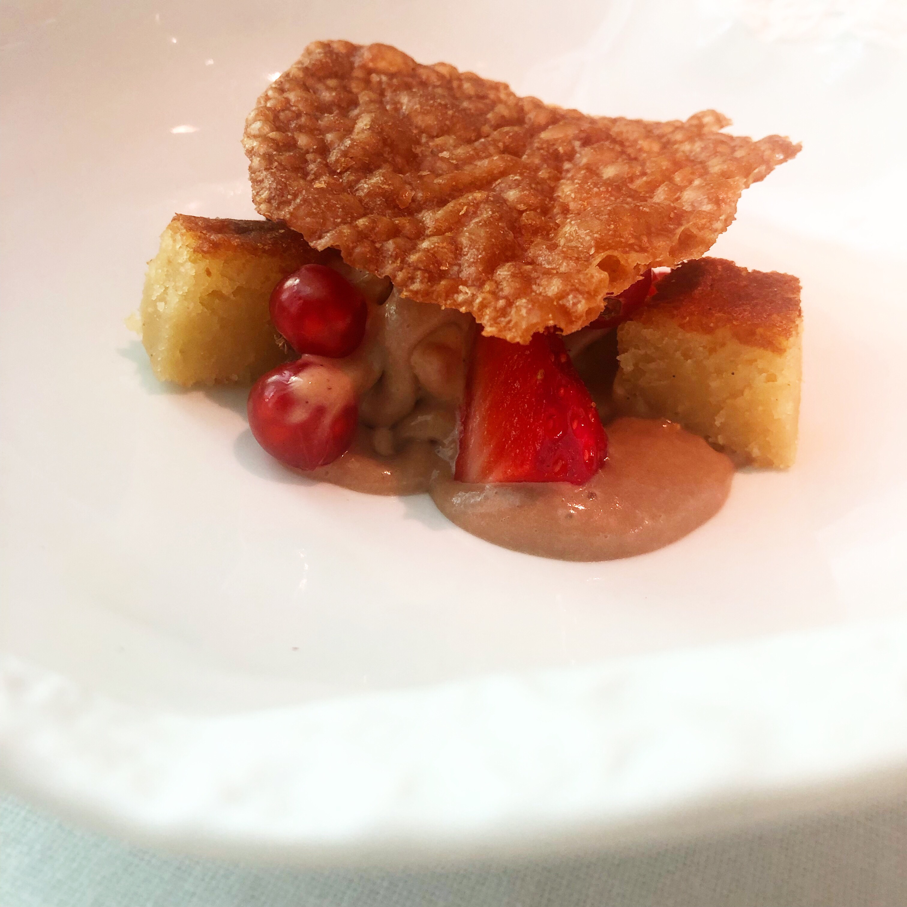 Rafa Zafra, como les decía al principio, se puede parecer a sí mismo y mantener la esencia en cada restaurante, pero no se copia nunca y cada local es diferente. Aquí se imponía la elegancia Belle Epoque del lugar y a un exquisito servicio, ha añadido platos tan clásicos de la alta cocina como la langosta a la cardinal y mucho trabajo de sala. El lenguado meuniere es prueba de ello, está delicioso y se sirve por dos personas. Mientras una trincha la gran pieza, la otra calienta la salsa con la que cubre los recios y sabrosos lomos. Esa salsa está montada con algo del colágeno del pescado, haciéndola más cremosa de lo habitual. Excelente.