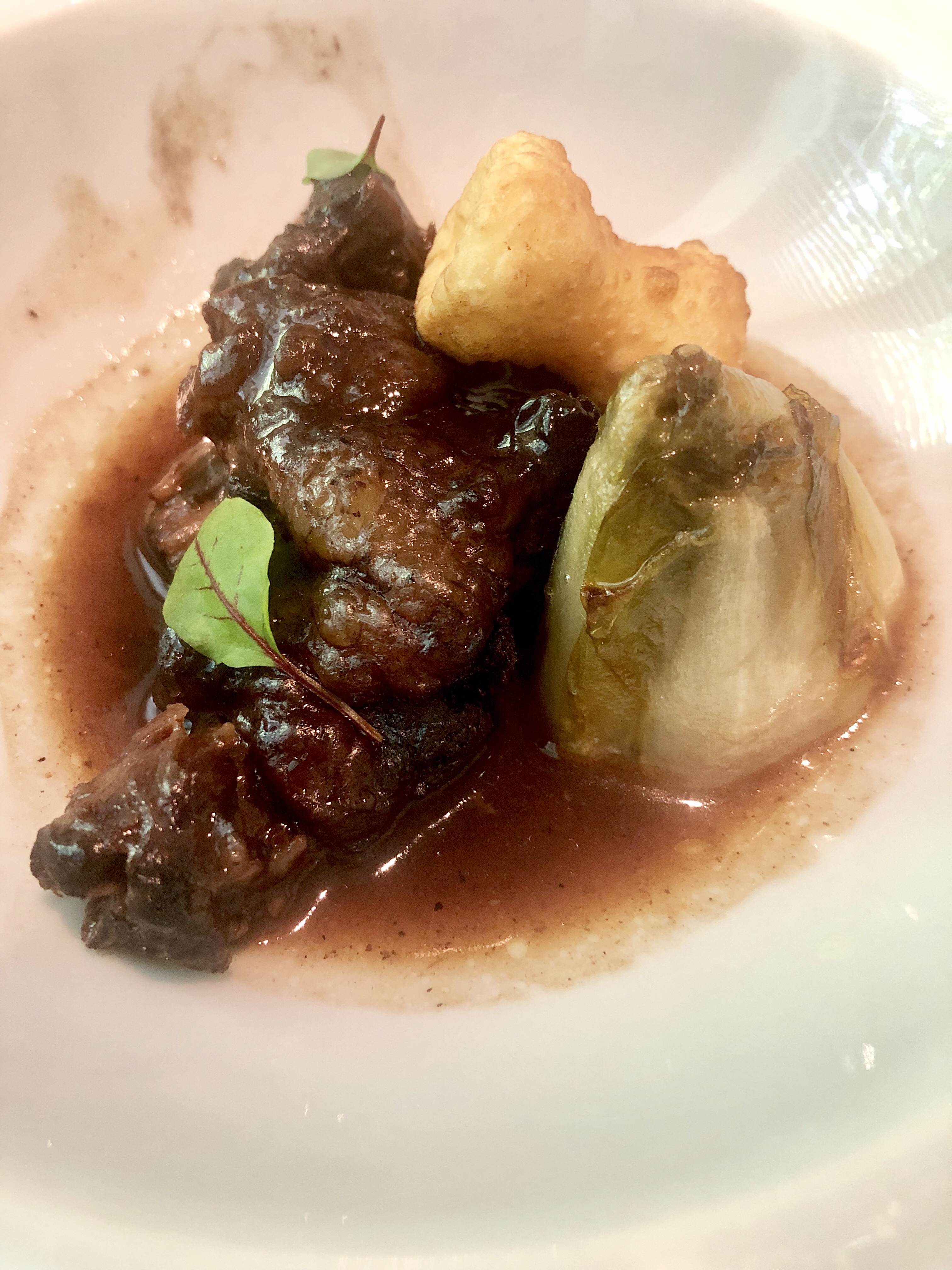 El rabón es un sabroso rabo de toro deshuesado, un poco duro y con alguna ternilla olvidada, un gracioso y único chip de yuca, una deliciosa endivia glaseada y una enjundiosa salsa de Oporto.