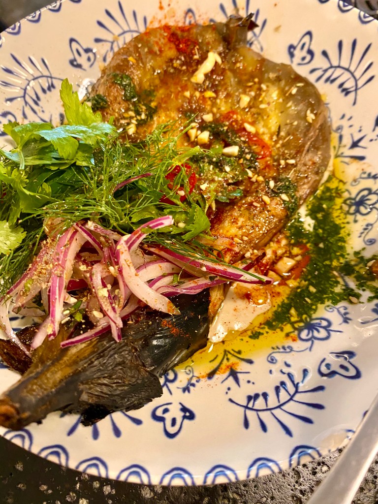 Reconozco que ya estaba muy bien predispuesto, pero fui totalmente ganado con un impecable huevo con caviar. La yema (sin duda curada) se esconde dentro de un tierno y brillante buñuelo. Y ese brillo se lo da una lonchita de lardo. Y otra vez la misma idea de antes de aumentar los sabores del ingrediente principal porque está muy bien potenciar la grasa y la salazón del caviar con las del tocino. La yema inunda la boca y se mezcla con todo lo demás envolviéndolo. Un bocado delicioso.