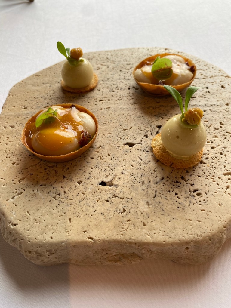 El menú intermedio (ya saben, ni el más largo mi el corto) se llama “Toledo olvidado” y comienza entre la sencillez del producto y el lujo de la inteligencia creadora con unos garbanzos encominados que son crema delicada con fuertes sabores a vinagre y cominos, lo mismo que el tatin de alubias es una tartaleta con el potente y tradicional guiso.