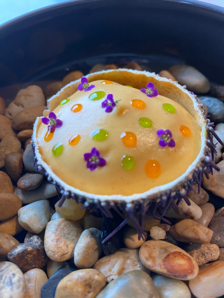 “La cocina de monte y mar” comienza con un precioso erizo que parece un pequeño jardín japonés, aunque con más flores, y es mezcla deliciosa de humildad y mar y tierra, porque se combina con una crema de almortas que suaviza el espinoso molusco.
