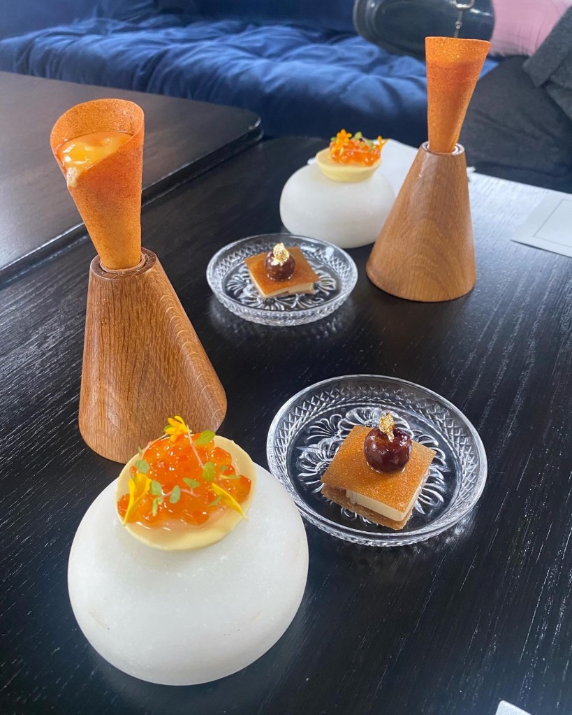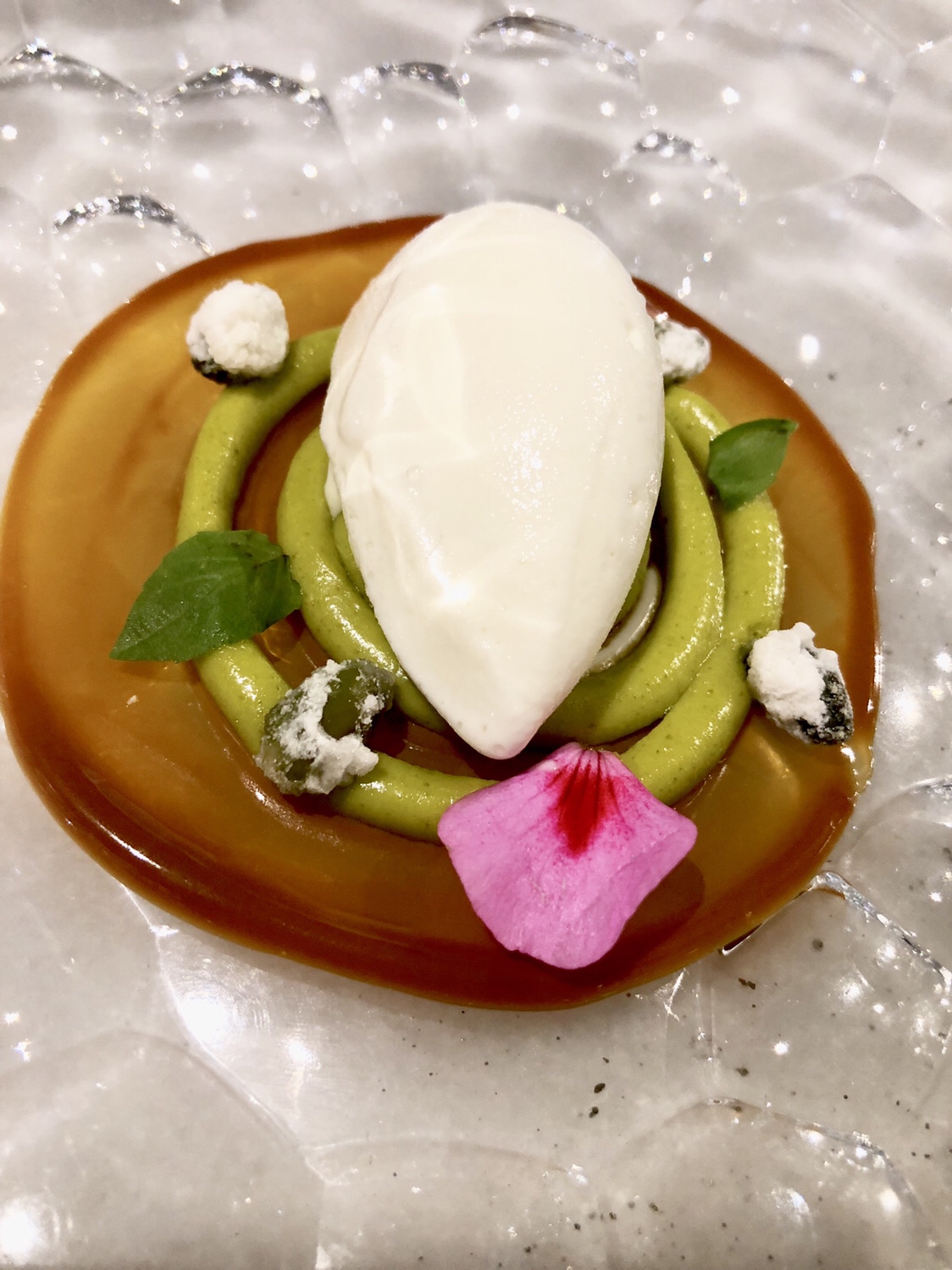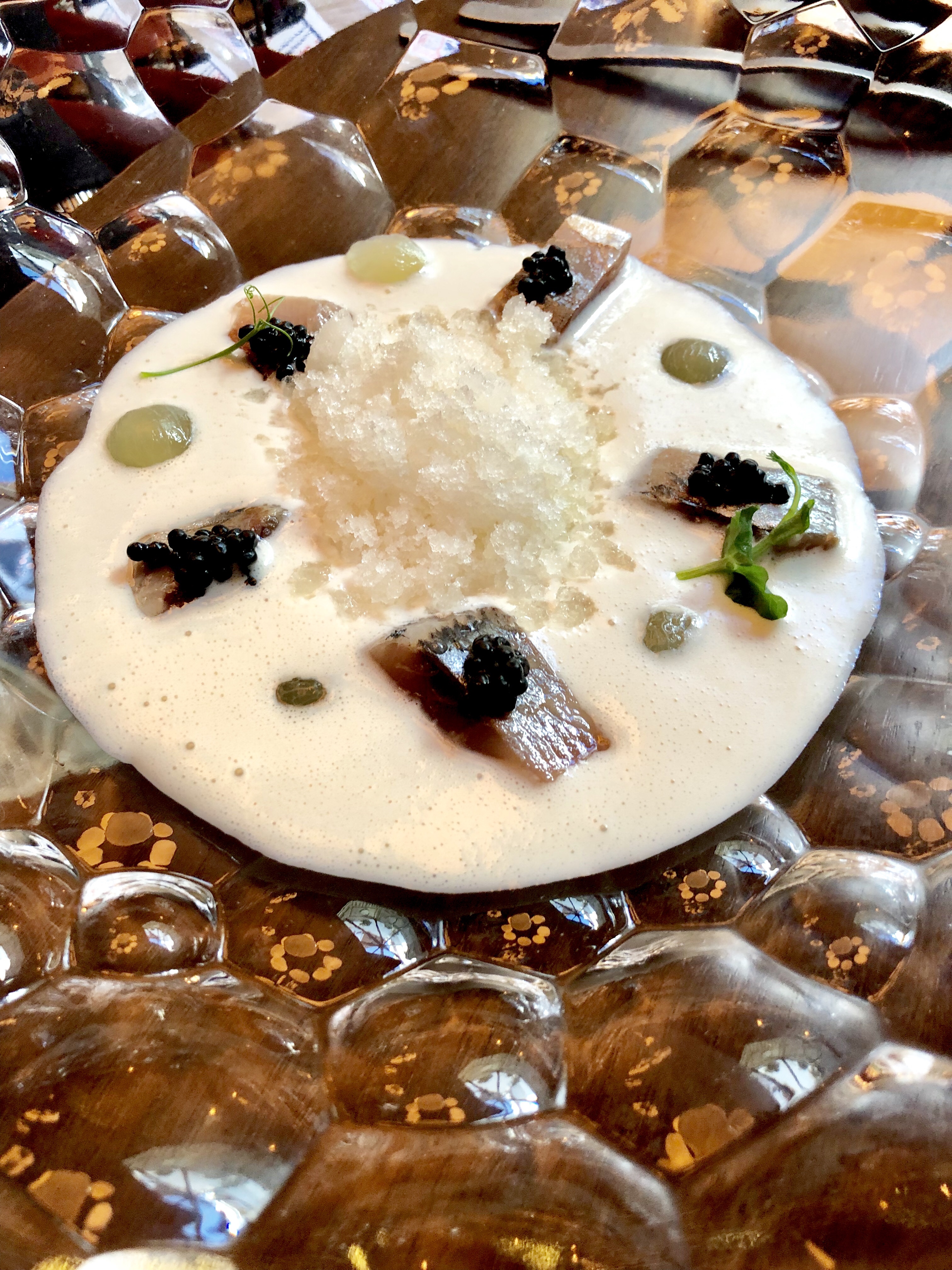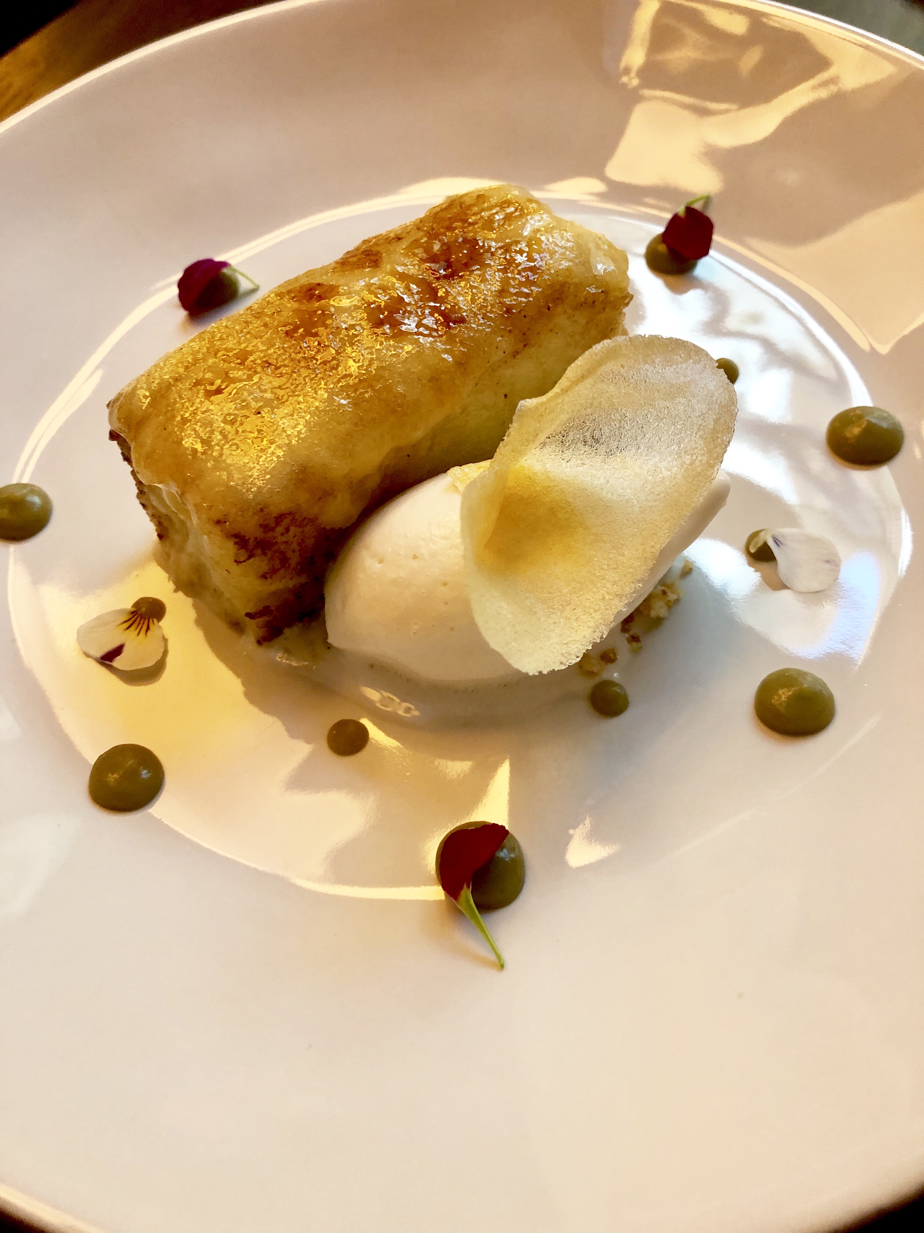 Y del disfrute del jardín, sea acristalado o al aire libre, se pasa al de la blancura luminosa del patio de carruajes, ahora cubierto, donde nos sorprenden con unos pimientos de cristal transformados mágicamente en cristal de pimientos y una sutil cuajada de bacalao con néctar de pimiento asado y un leve y delicioso toque picante.