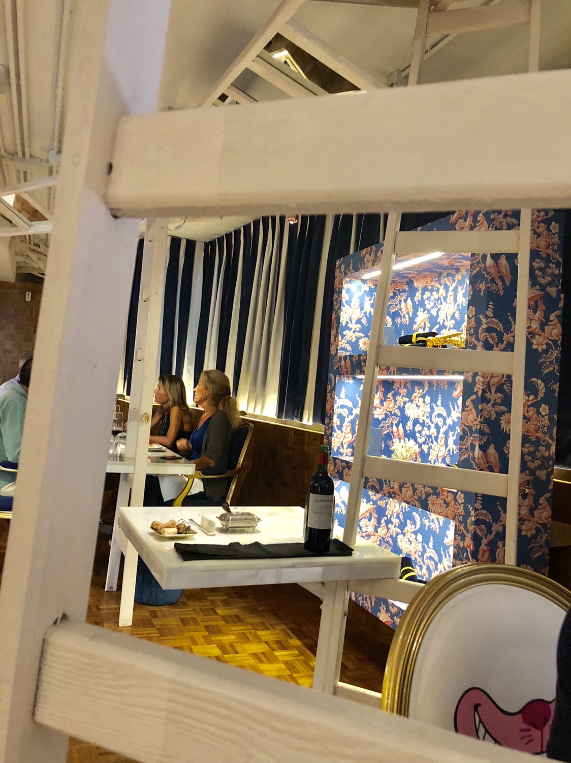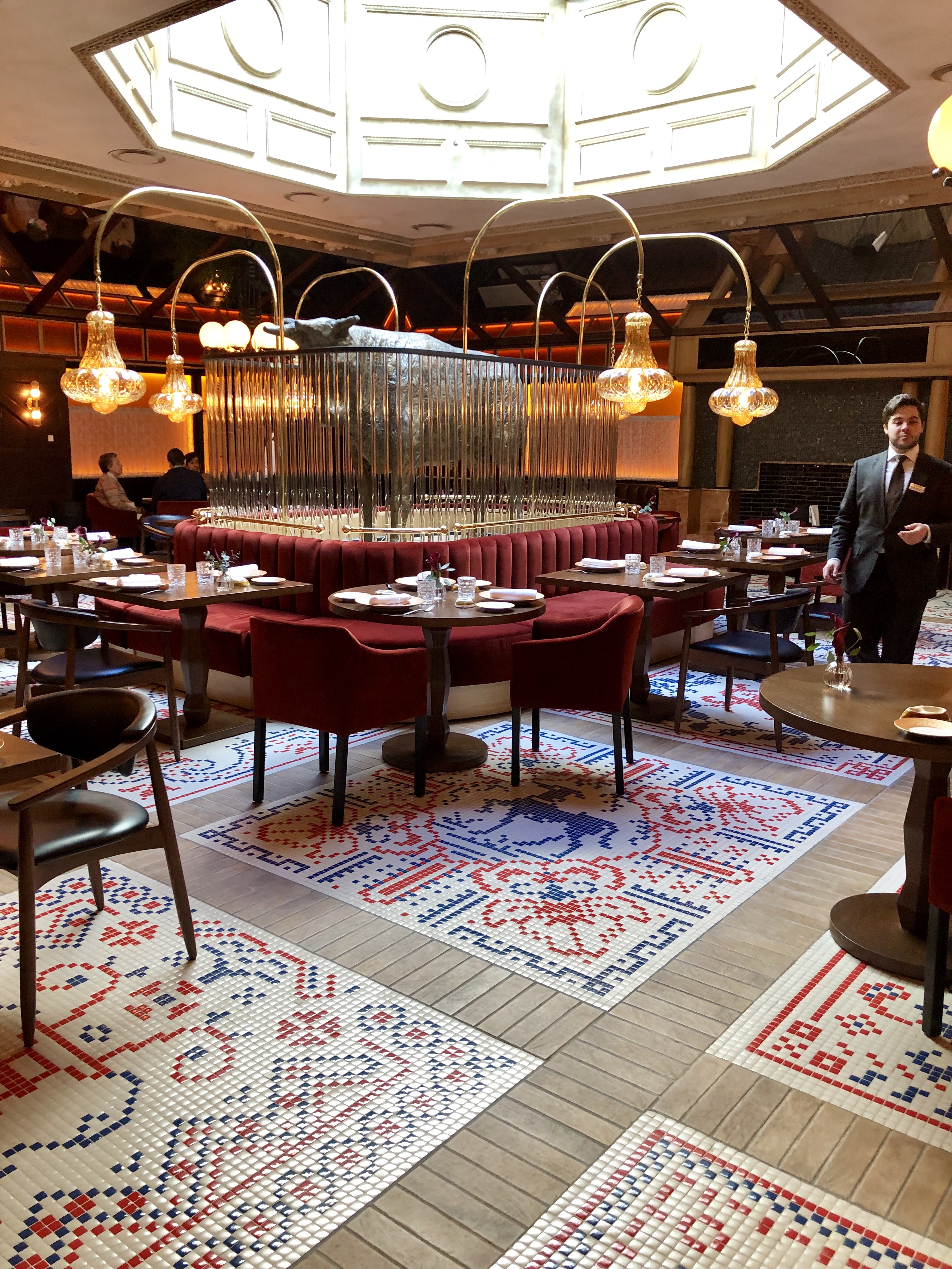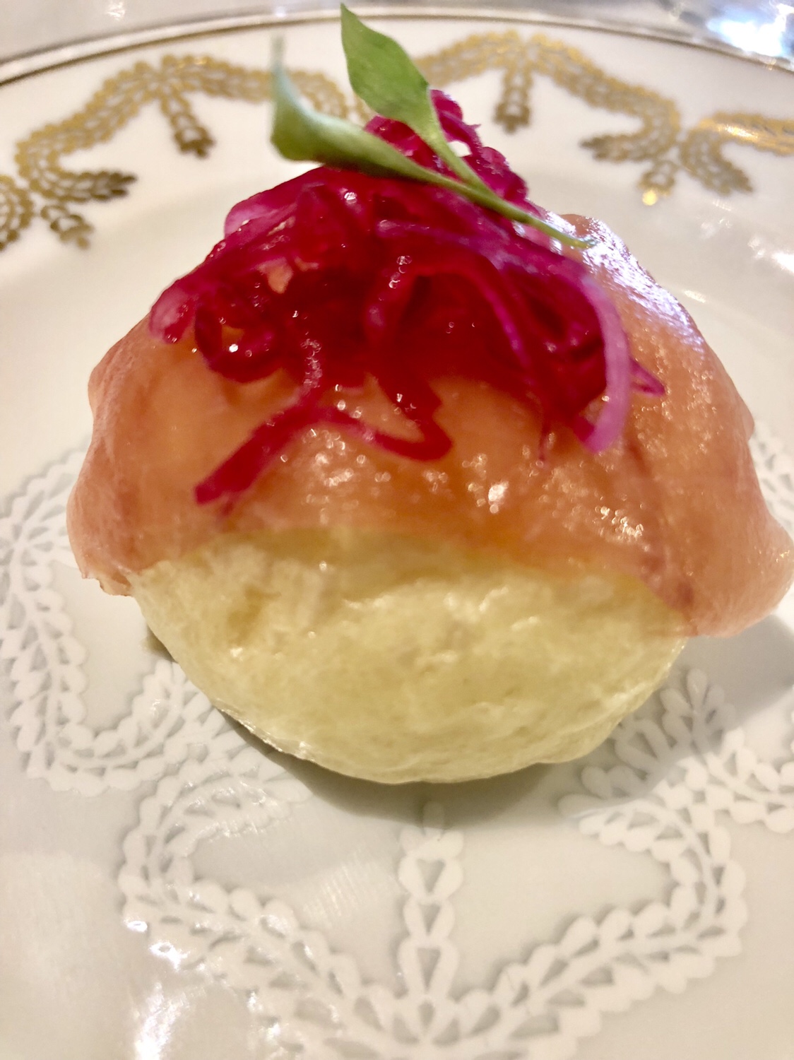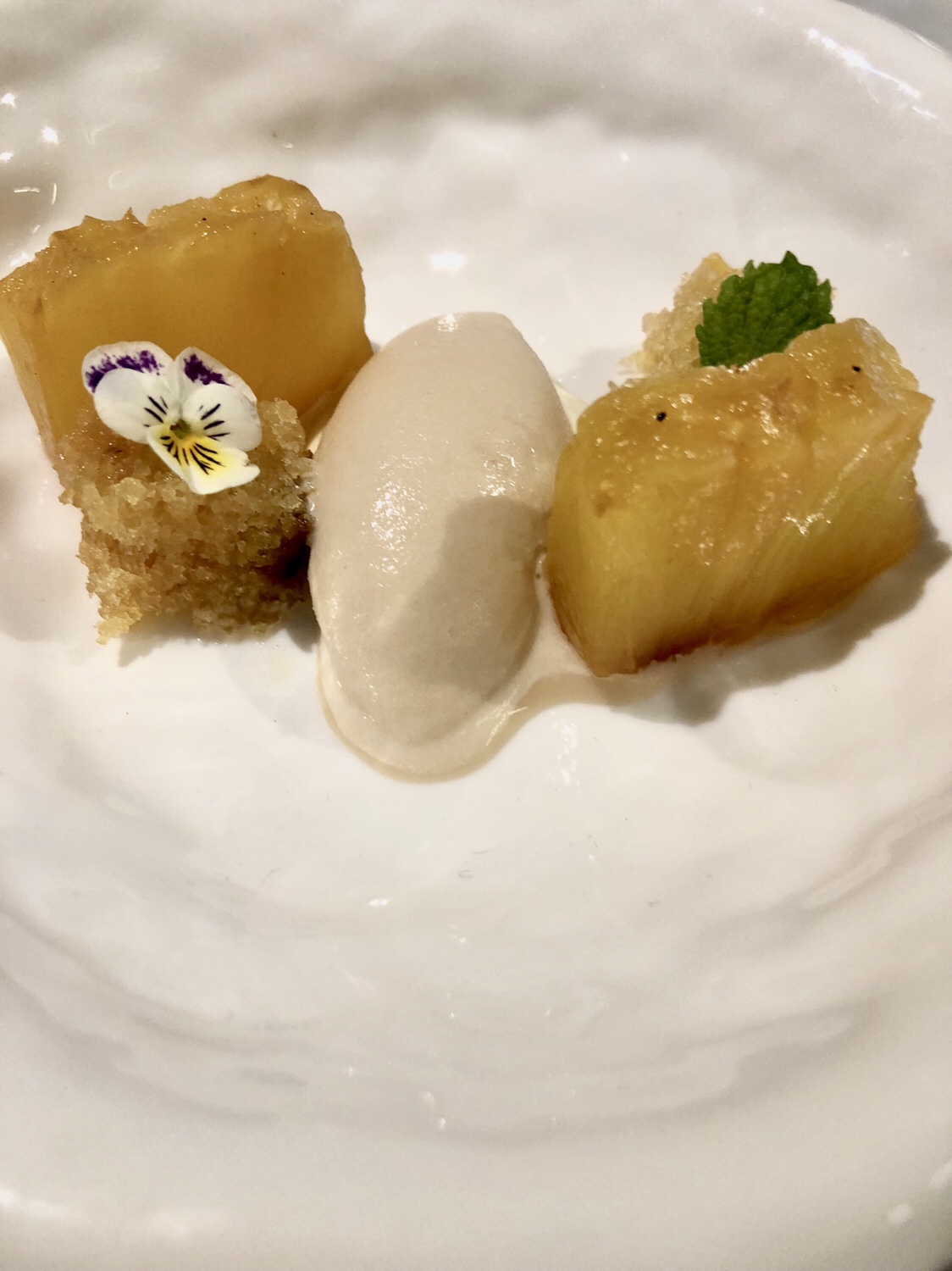 Y del disfrute del jardín, sea acristalado o al aire libre, se pasa al de la blancura luminosa del patio de carruajes, ahora cubierto, donde nos sorprenden con unos pimientos de cristal transformados mágicamente en cristal de pimientos y una sutil cuajada de bacalao con néctar de pimiento asado y un leve y delicioso toque picante.