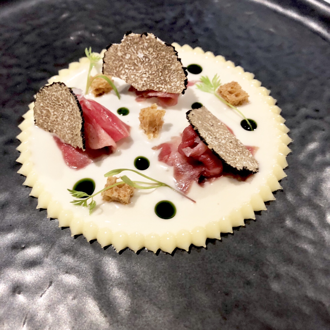 Para acabar, un delicioso bonito en que parece mojama gracias a una delicada curación. Se sirve cortado finamente con tofu de almendra y un delicioso ajoblanco. Junto a él, una sobredosis de sabor marino en forma de crujiente: roca de tinta de cachón y tartar de lo mismo.