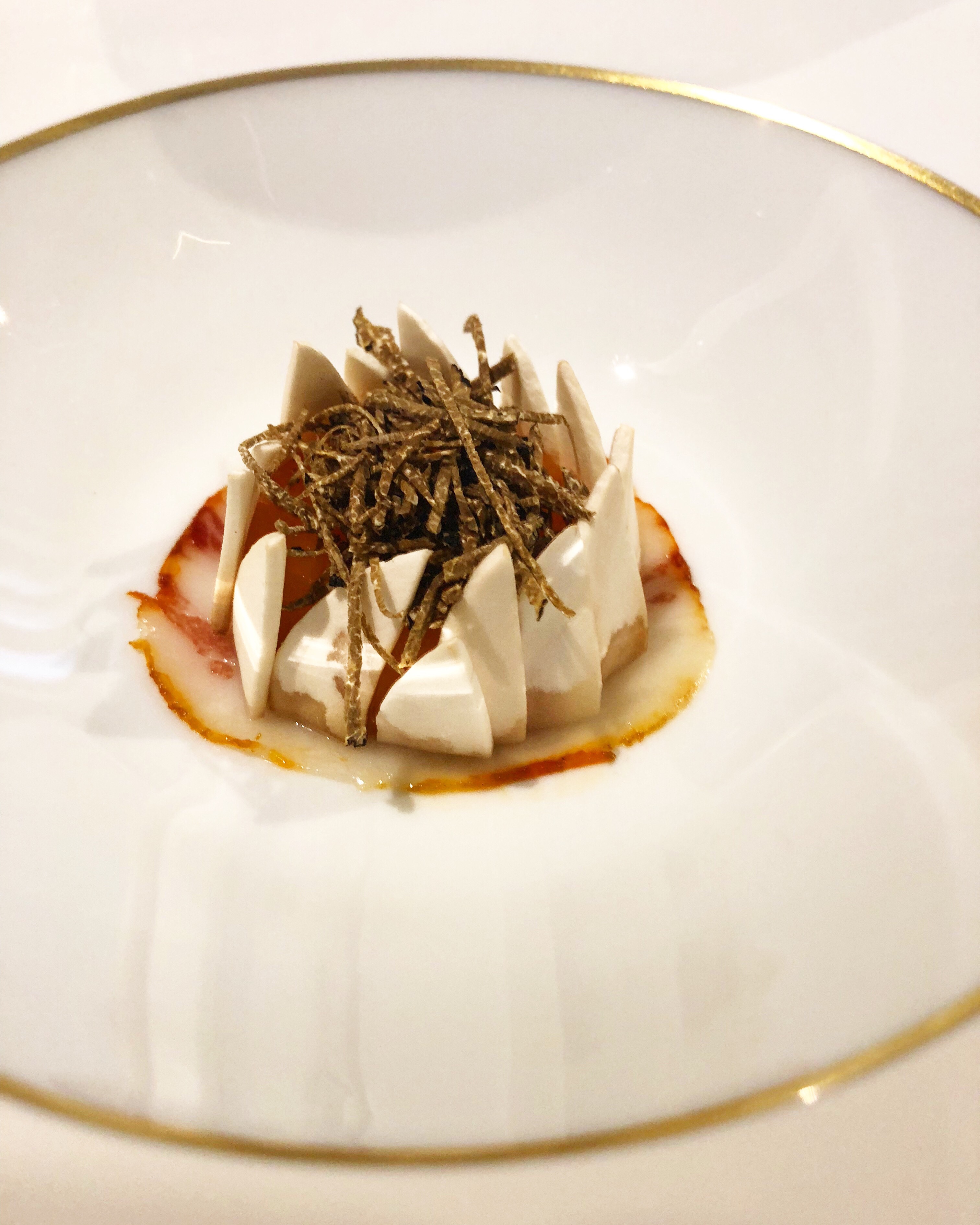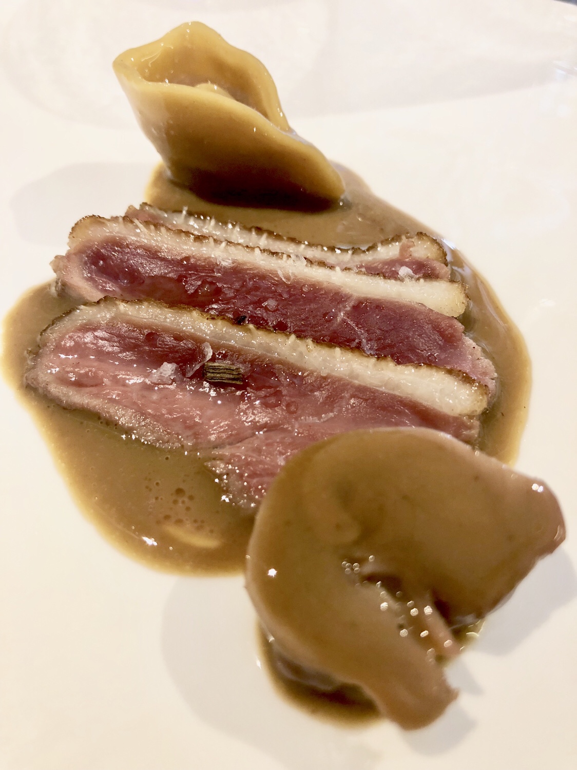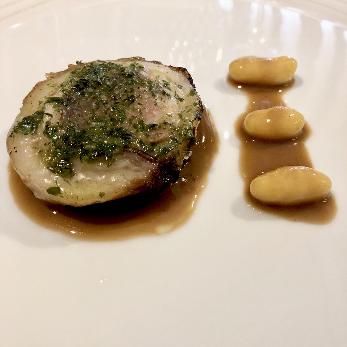 Cuando llega la secuencia de la liebre nos damos cuenta que vamos de más en más. Es toda una sinfonía en tres platos (estaba tan maravillado que solo hay foto de uno): a una potente (cómo me gusta que Jesús sea señor de sabores contundentes) morcilla, aligerada con berza salsifí, apio y aterciopelados ñoquis de apionabo, se añade un envoltillo de explosivo sabor a base de liebre y foie. Aparte, un transparente consomé de liebre con setas enoki a modo de fideos. Por fin, un lomito -que es la sorpresa de sabor porque parece sin más, pero es una maravilla de adobado-, con salsa de caricos (alubia cántabras) para mojar. Había comido memorables platos de liebre en el Celler de Can Roca y en Ramón Freixa, por ejemplo. Después de este, ya no sé qué más decir.