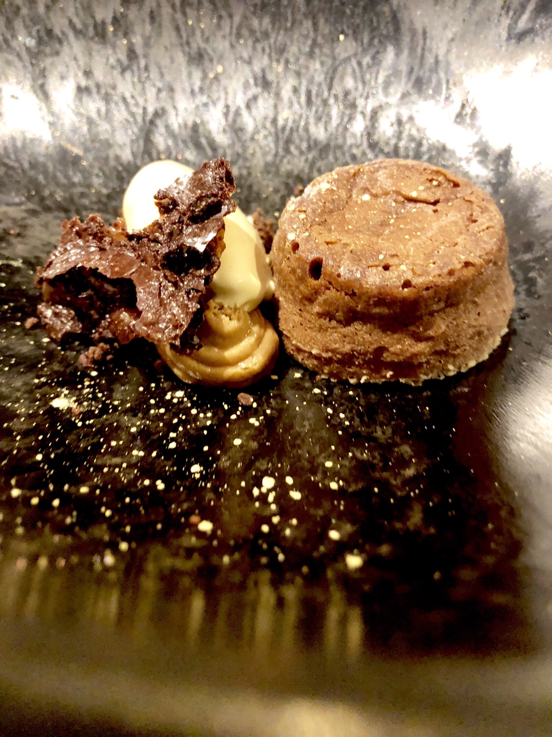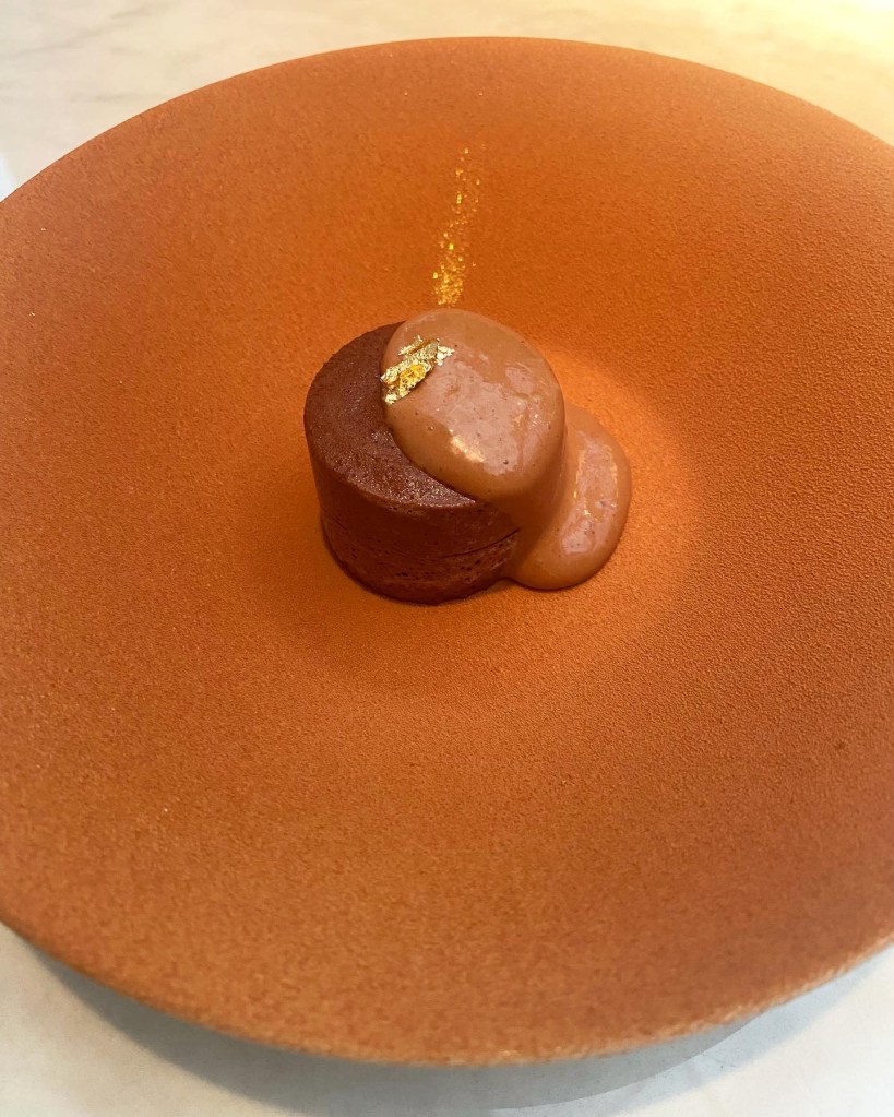 Y hablando de coulant, lo que parece ser uno y sin embargo, es una gran obra de repostería, una emulsión aérea de cacao con núcleo fundente, lo que viene a ser la versión magistral y a sabia de ese ya insoportable coulant pero aquí sin rastro de harina ni calores y con una cobertura sólida y un corazón semilíquido. Muy parecido a uno que es para mi el canónico, el que hacía Alain Senderens, una versión -como esta- alquímica y casi imposible.