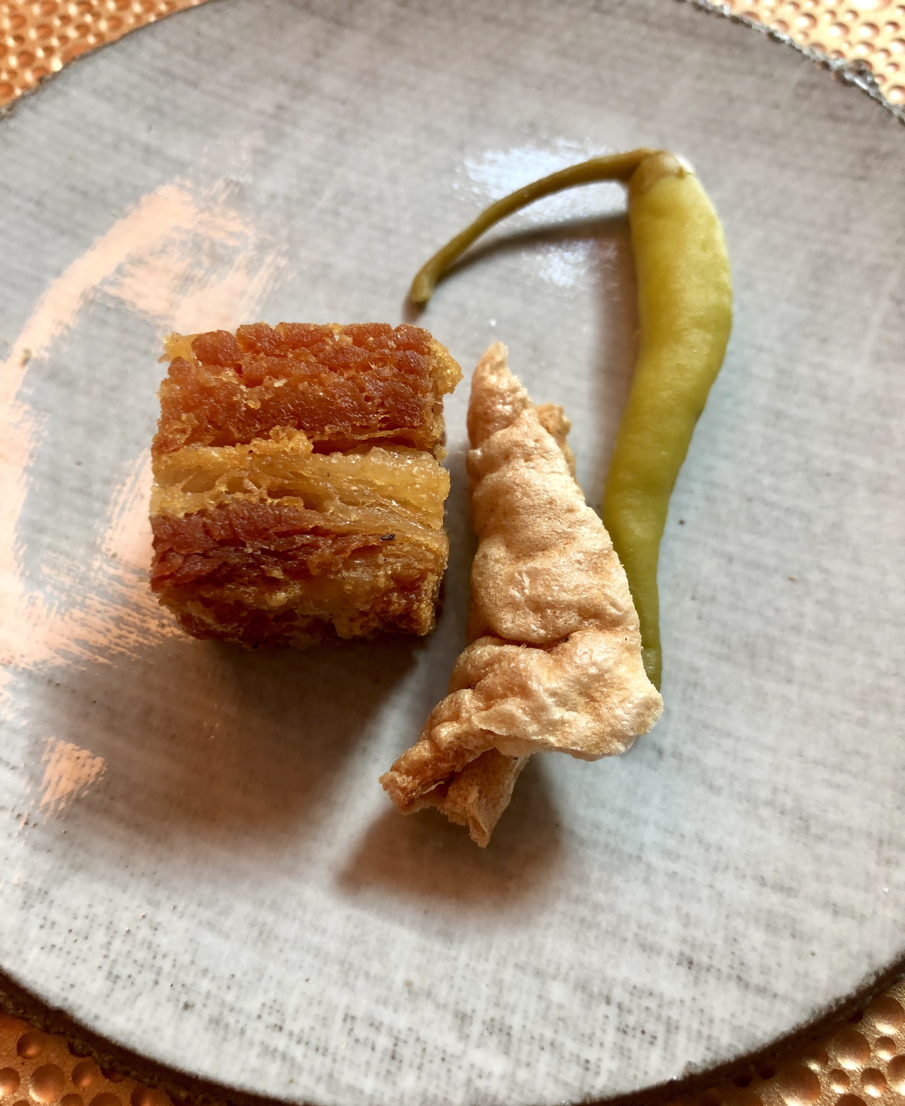 El primer postre es un arroz con leche convertido en un delicado mochi, tierno por su masa y crujiente por el fino caramelizado.