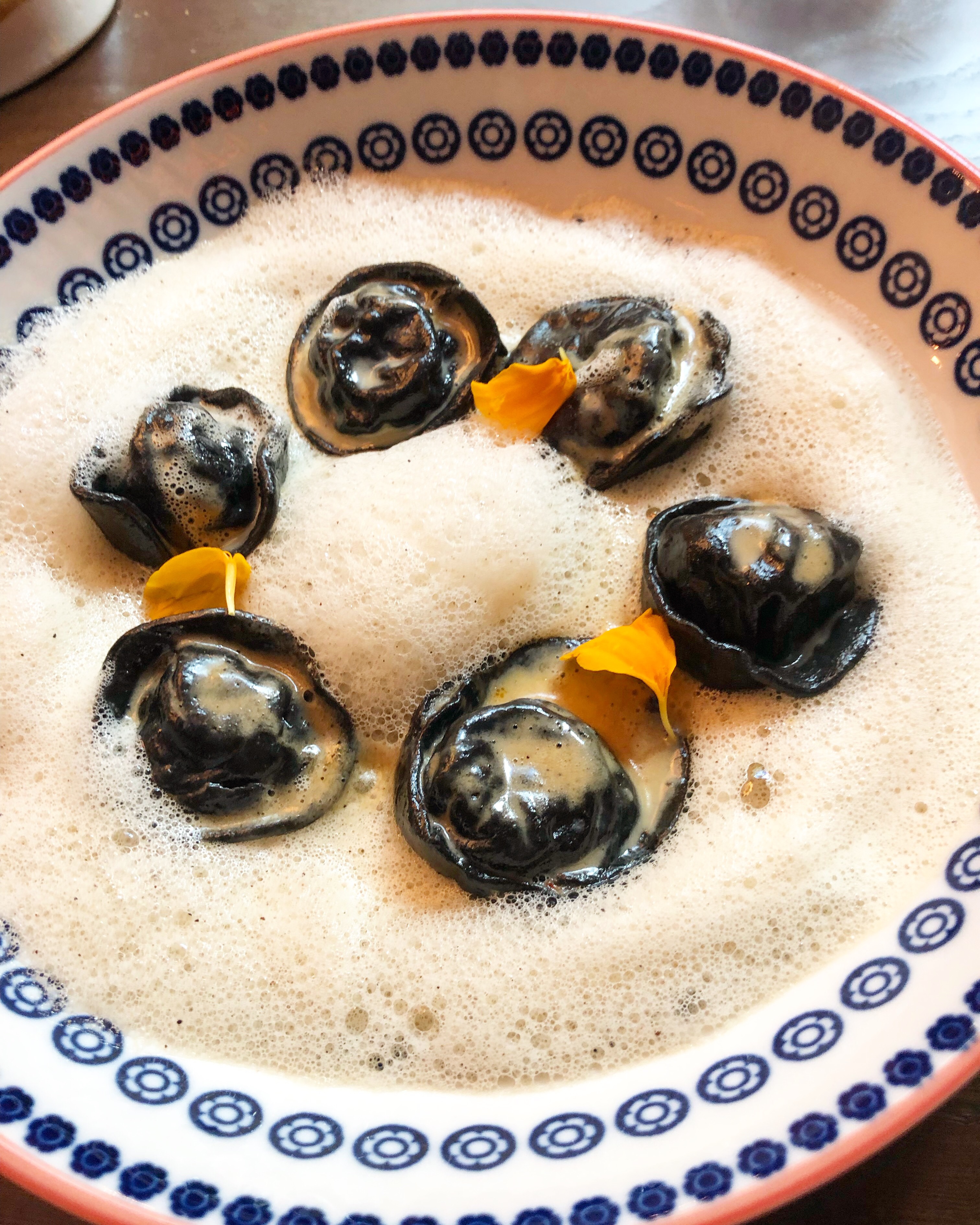 El magano de guadañieta es un escaso y exquisito calamar de temporada muy corta, pescado con es tipo de anzuelo. Aquí lo visten con las galas de un imponente marmoreado de tinta y pilpil de cogote merluza (me recuerda a la gamba Chanel de gran Rui Paula en la Casa de Cha da Boanova) y lo rellenan de modo tradicional con un lento, larguísimo y majestuoso guiso de sus patas y aletas con verduras que solo se ve superado por la esencia de guiso y tinta que lo acompaña. La tradición mejorada por manos sabias y las posibilidades de un restaurante así.
