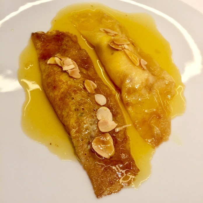 Hay postres nuevos (echo de menos suflés) pero no me interesan, porque hay que pedir Crepes Suzette, otro plato en extinción. Los hacen a la vista del comensal, repletos de naranja y licores y con una pequeña lámina de beurre Suzette rellenándolos. Pocos lo hacen ya pero para mí es un acierto mantener esta preparación tan canónica. Me encantan con tantos sabores, lo aterciopelado del relleno y el crujiente de las almendras laminadas.