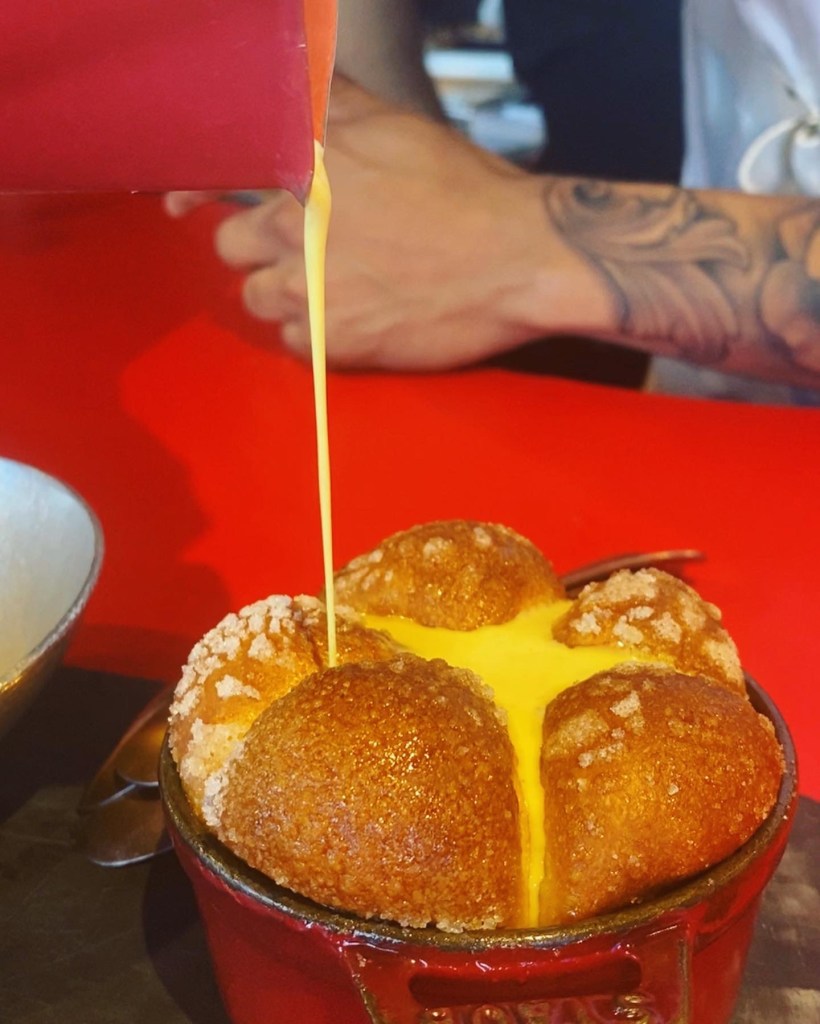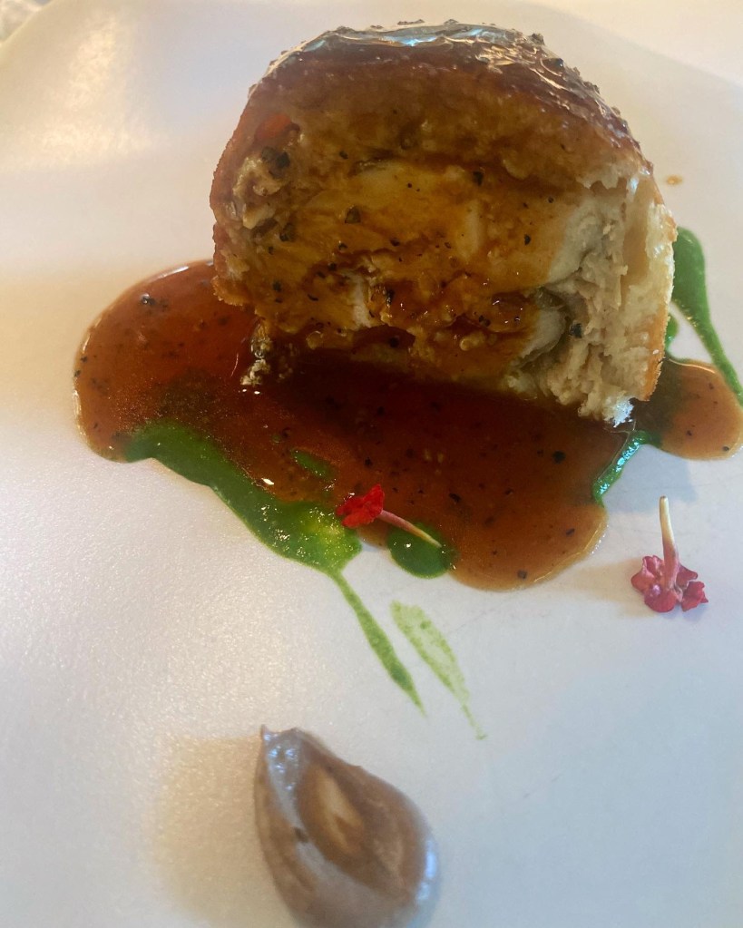 A continuación, una magistral obra de artesanía: brioche de pularda con trufa y salsa de hierbas frescas. Un plato casi adictivo, de sabor intenso pero delicado a la vez y muy elegante. Por si fuera poco, se trincha a la vista del cliente en un bello espectáculo.
