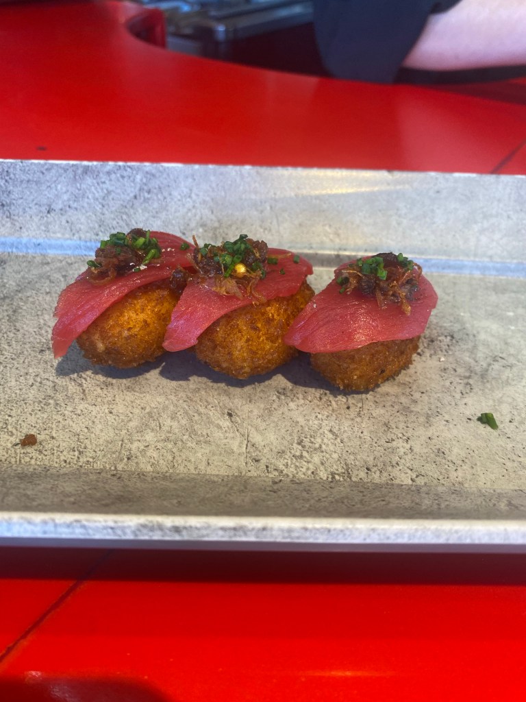 Y después, una regla con bocados históricos: el canelón de la madre, bollo de brandada de bacalao, magdalena de pollo, sonsos en tempura y mar y montaña vegetal.