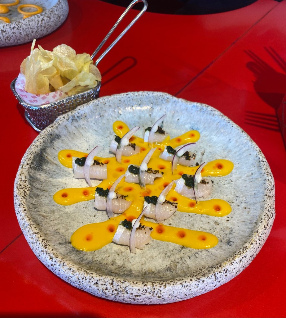 La caballa es recia por el marinado, la salsa de la misma caballa llena de sabor y varios encurtidos.