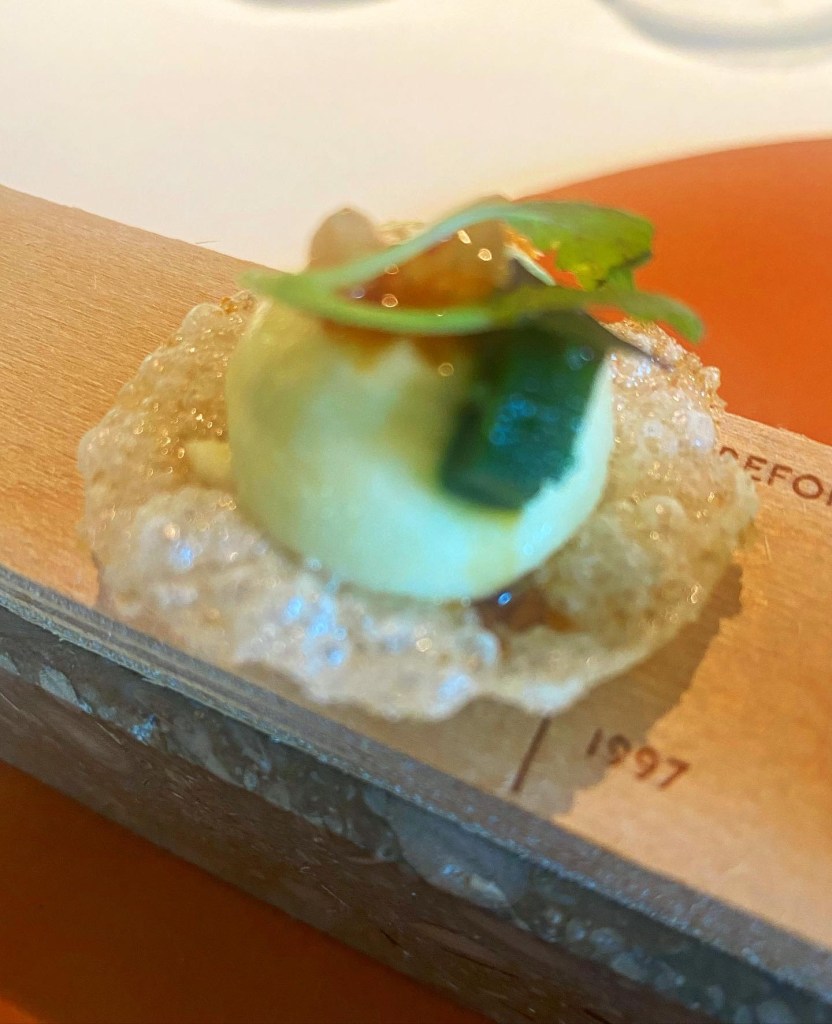 Llueve en el pinar tiene la puesta en escena más cautivadora que he visto nunca. Esa espuma flotante es traída en equilibrio por la camarera, como si hiciera magia, hasta su soporte. No sabe a nada pero “llueve” realmente sobre un parfait de miel y piñones. Y sobre granizado de limón y hierbas.