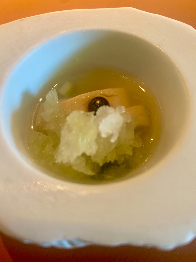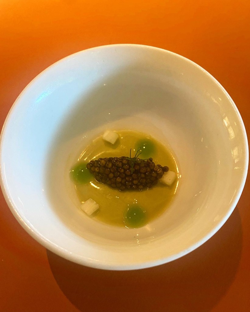 Y sigue la cabalgata de saber, sabor y perfección con una delicada velouté de hinojo, un cuajado delicado con agua de mar y caviar.