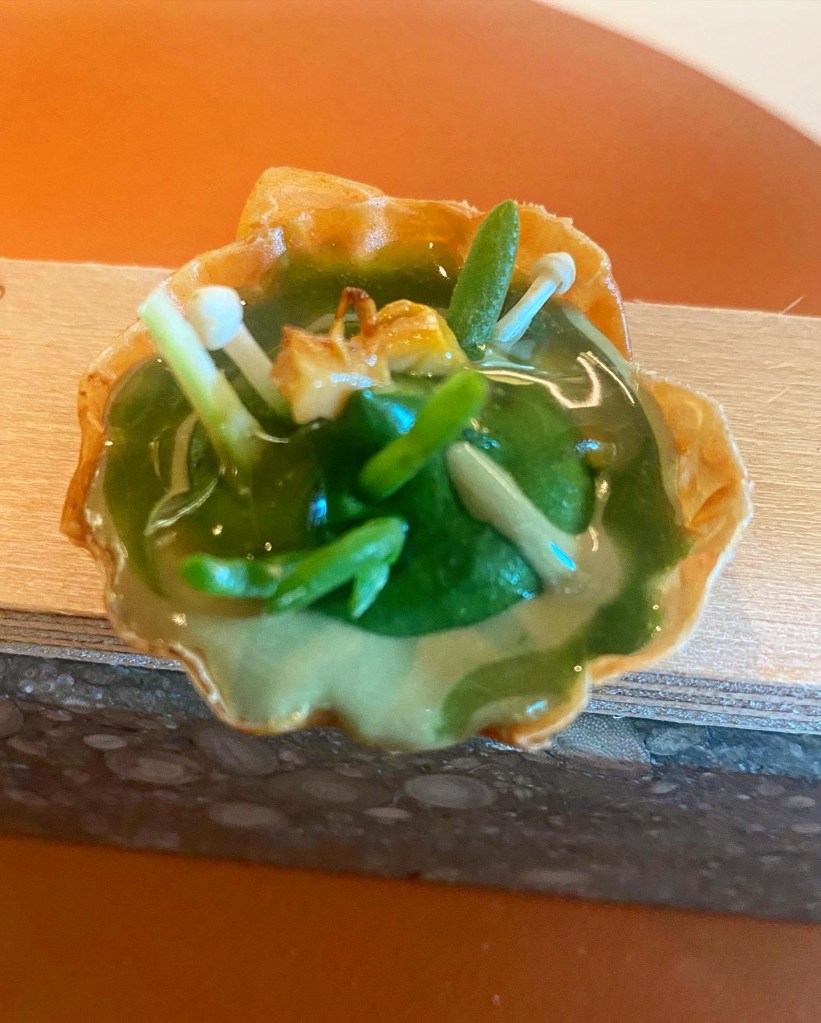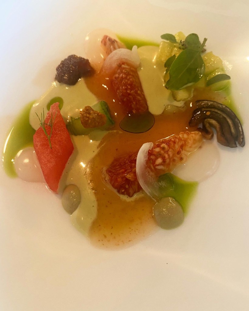 Esa fuerza de tanto sabor, da paso a una asombrosa y magistral secuencia de platos vegetales radicalmente actuales: lechuga, salsa de ortigas y ajoblanco de macadamia, granizado de lechuga y pepino y colinabo precede a la sopa de higo, pistacho y hoja de higuera, que es esencia y aroma de higo, con varios encurtidos y un toque fresco de sandía.