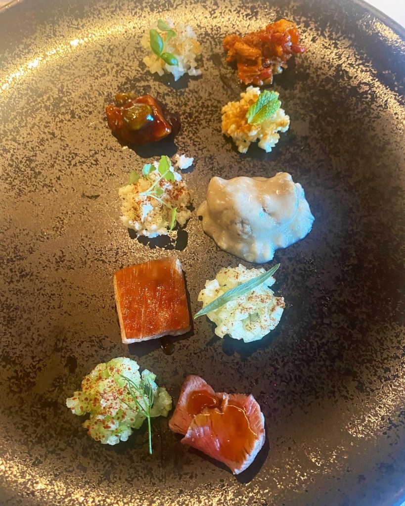 Dos carnes extraordinarias para rematar la faena salada: una sobrecogedora sinfonía de cordero (cuello, mollejas, manitas y sesos, ventresca y lomo, cada una con un diferente cuscús: de apio, apionabo, coliflor, manzana o pepino)