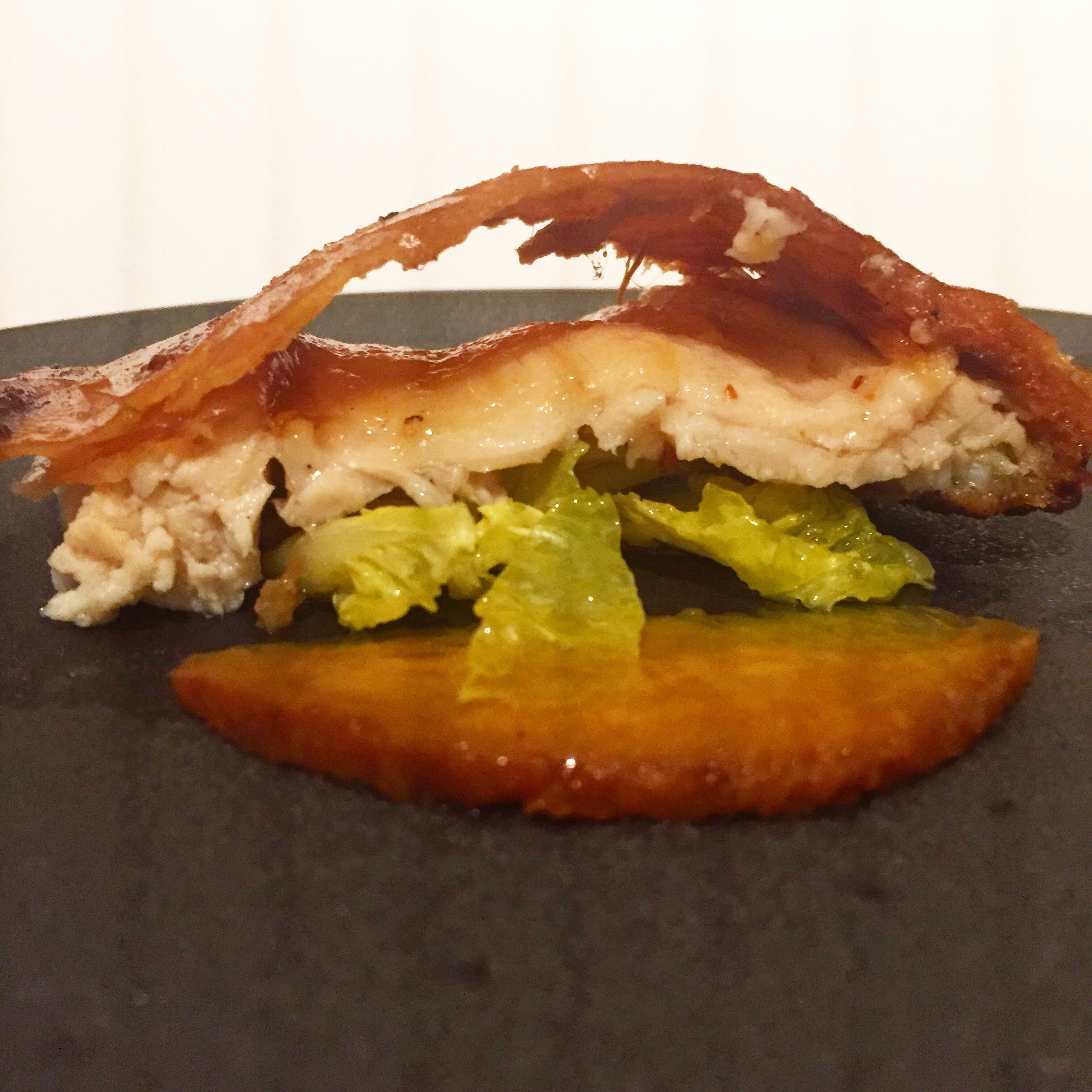 La carne parte de la idea de comerse una salsa, la de unos canelones rellenos de ragú de jabalina y con ellos se hace, durante muchas horas, la que preside el plato. Leche frita cubierta de velo de leche búfala y el borde de una pizza al vapor, frita y después al horno. Y con trufa negra mucho mucho mejor. Y por supuesto, la carne: un tiernísimo y muy jugoso char siu (barbacoa china) de jabalina, tostada y glaseada, que se deshace en la boca.