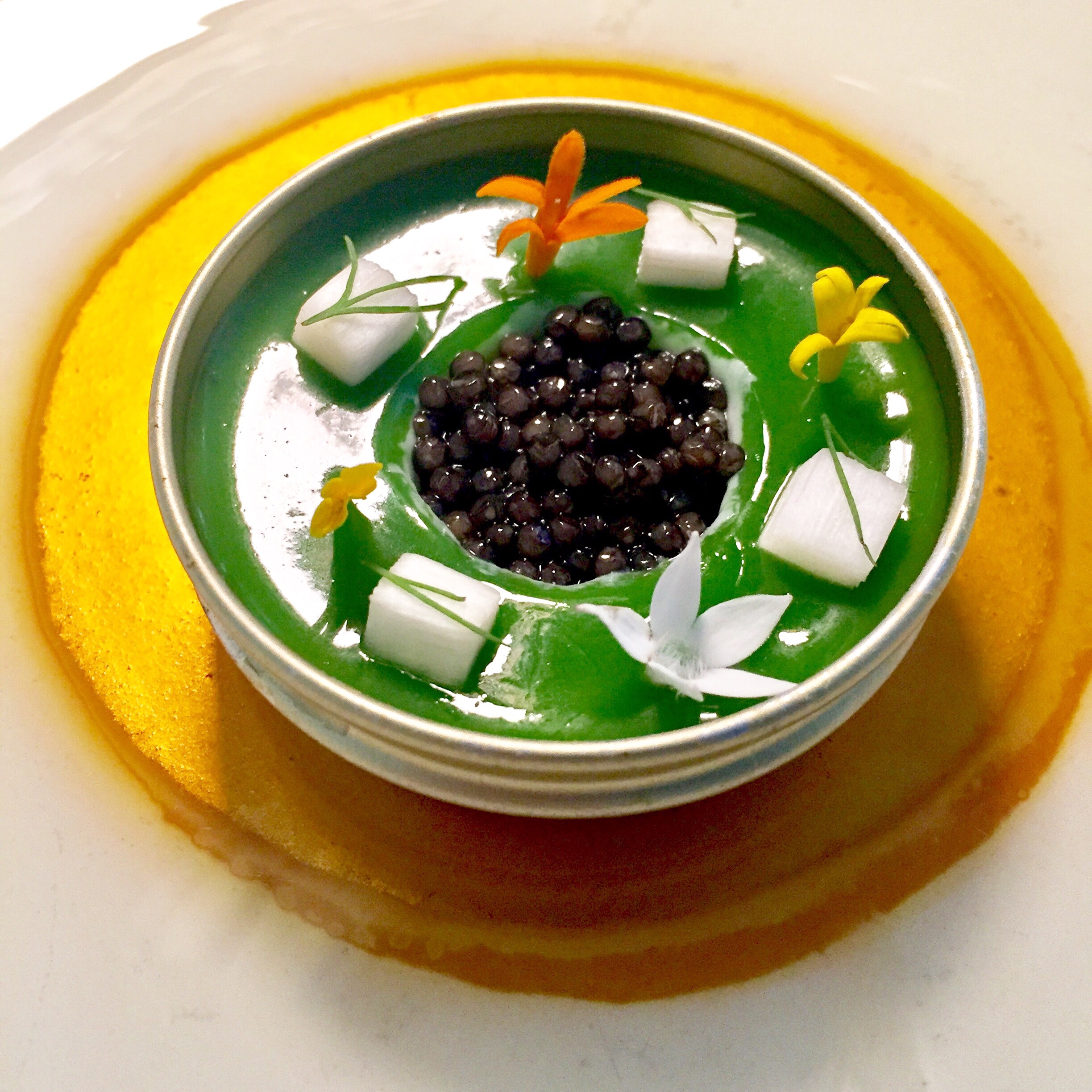 Lienzo 11. Angulas «acariciadas» en el wok con salsa de ostras, cebolletas y huevos fritos al ají amarillo… técnicas inéditas del wok!! Ya sabíamos que Dabiz era arriesgado y audaz hasta escribiendo su nombre con B y Z pero nada lo es tanto como cocinar las angulas de  manera diferente a la tradicional. Tiene su riesgo por la fuerza de la ortodoxia y porque es muy fácil anularlas. Sin embargo esas caricias del wok y los aliños escogidos, las realzan increíblemente por no decir nada de ese prodigioso huevo frito transmutado en buñuelo, vestido de ají amarillo y no de ajo. Nunca unos huevos fritos con angulas fueron tan elegantes y cosmopolitas. De Euskadi al mundo, pasando por Madrid