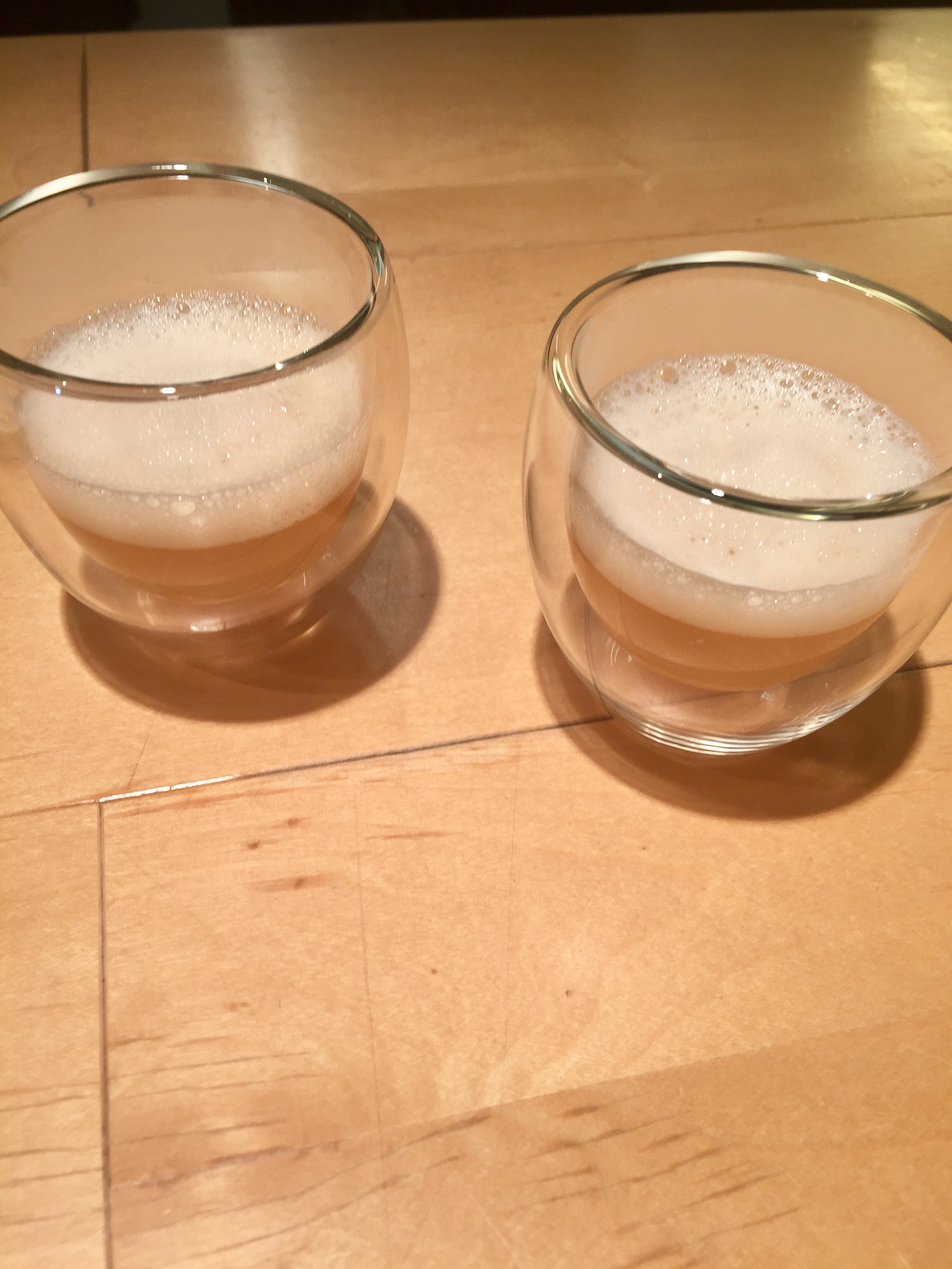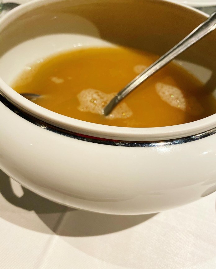 Después, primer vuelco, una bella sopera con una deliciosa y bien desgrasada sopa de fideos que es la que recoge todos los sabores resultantes de la cocción de legumbres, verduras y carnes, es decir, una maravilla. El fideo cabellín apenas se hace notar, dando protagonismo al caso, pero aporta textura. En plan opulento se sirve con cebolla en aceite, piparras (creo yo que esto en una concesión a nuestros compatriotas del norte y más adecuada a la fortaleza de las alubias rojas que a la delicadeza de esta sopa) y, otra distopía, unos esponjosos y suculentos buñuelos de cocido.