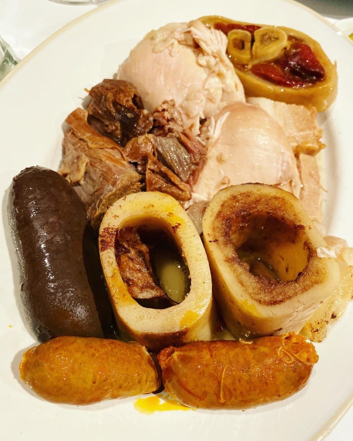 Y ese es el tercer vuelco, un festival de viandas no aptas para veganos ni para inapetentes: pollo, huesos de carne con su tuétano, punta de codillo (hueso de jamón), chorizo, morcilla de cebolla (aunque también admite la de arroz), morcillo de ternera y tocino. Todo estupendo. El secreto: la mejor calidad, porque este es un plato sencillo pero la cantidad y calidad de los ingredientes lo hacen tan lujoso como se quiera. Aquí no hay pelota, como en Lhardy, pero no se echa en falta.