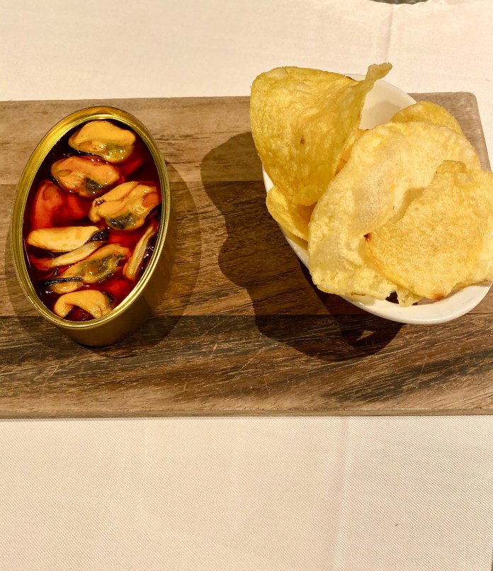 Además de los trenes vuelcos, dan muchas otras cosas que lo hacen opulento y elaboran hasta una distopía que les contaré en su debido momento. Llega a la mesa para empezar unos deliciosos, suaves y perfectos mejillones en escabeche con patatas fritas, para quien no lo sepa, aperitivo madrileño donde los haya. Me han encantado.