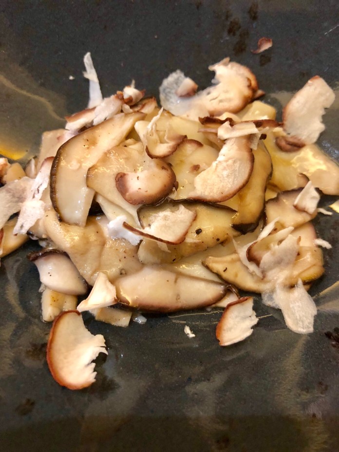 En esta orgía de productos de primavera de la que solo estuvo ausente el espárrago, llegó después la reina de las setas preveraniegas, unos pequeños boletus, plenos de sabor a campo y a bosque, a humedad y a musgo. Unos cuantos salteados levemente y el resto crudos y laminados, lo que aporta crujientes y un desperdigarse por la sala todos los aromas mencionados.