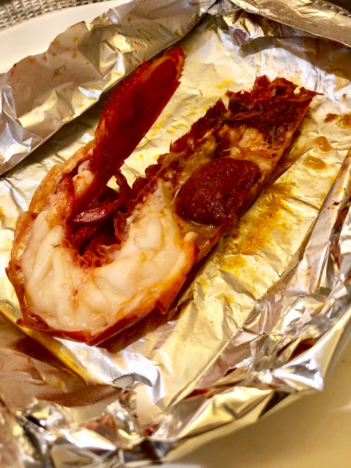 Y tras la corte vegetal, más realeza, esta vez del mar. La majestad del carabinero -ya saben, casi mi crustáceo favorito- vestido de sus púrpuras y de otro más, el de un punto de sobrasada en la cabeza. Queda muy bien por raro que parezca. Al menos en esta preparación en bolsita de plata (¿papillote es español?).