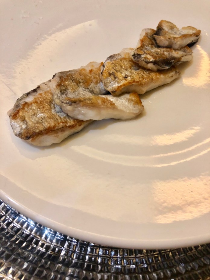 Unas minúsculas cocochas de merluza sutilisimas y crujientes esconden un poco de tinta de calamar que realza su sabor y las refrescan. Como en todo lo demás, un simple toque para redoblar los sabores sin tapar ninguno.