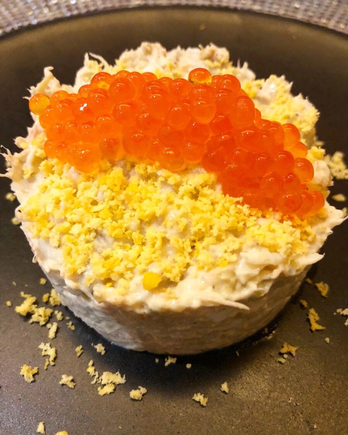 Esta vez no pagué. La visita se debía a un regalo de «menú degustación con maridaje» (qué horrible palabra) realizado por un culta y refinada amiga, cómo no, clienta muy habitual y querida, así que fuimos muy mimados. Para empezar una excepcional torta de aceite y una buena ensaladilla rusa. La verdad es que no salgo de casa por este plato pero realmente era la reina de las ensaladillas, más aún por el añadido de las restallantes y salinas huevas de trucha.
