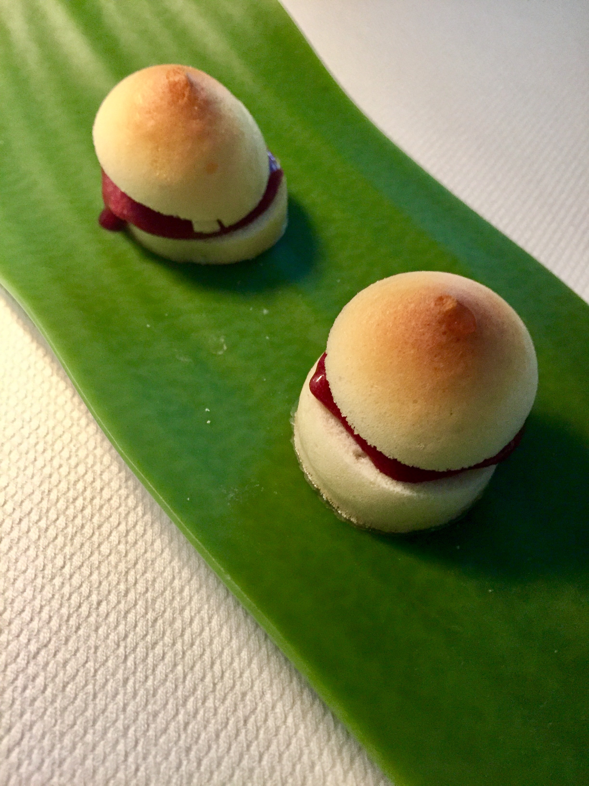 Se acaba lo salado con el pato (en) dos cocciones con curry de ajo negro. Primero se presenta una opulenta pieza entera, dorada, crujiente y recubierta de pimienta de Sichuan, miel, semillas de comino, lavanda, etc. Una delicia para la vista. Después un trozo de la pechuga con una maravillosa royal de pato que me recuerda a la madre de todas las royales, la que borda Ramón Freixa cargándola de trufas, foie y vino. Un final clásico y elegante lleno de maestría para un ave con un punto perfecto.