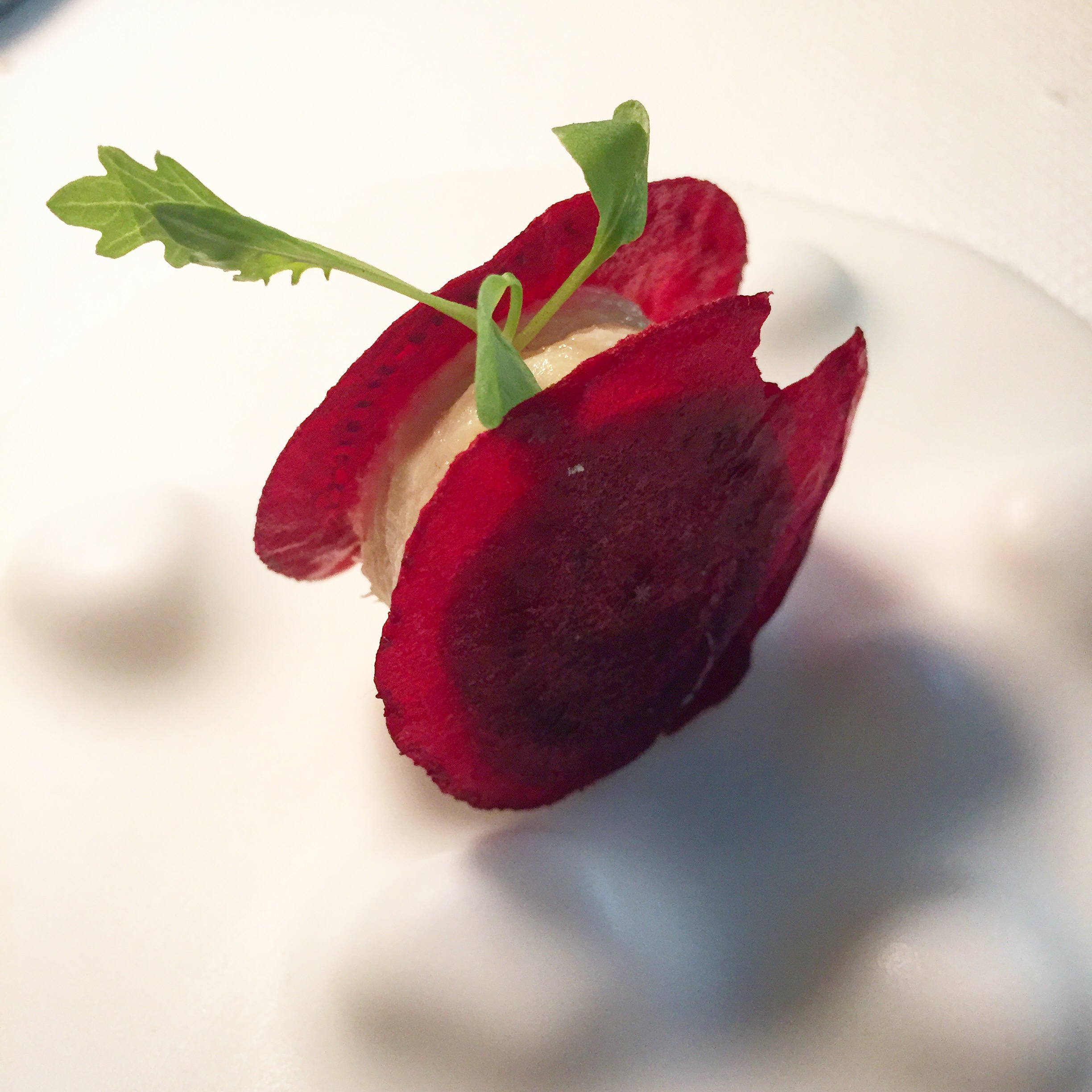 La remolacha con brandada de anguila ahumada es otro aperitivo ligero, elegante y muy bonito en el que el dulzor de la remolacha atempera la sal del bacalao.