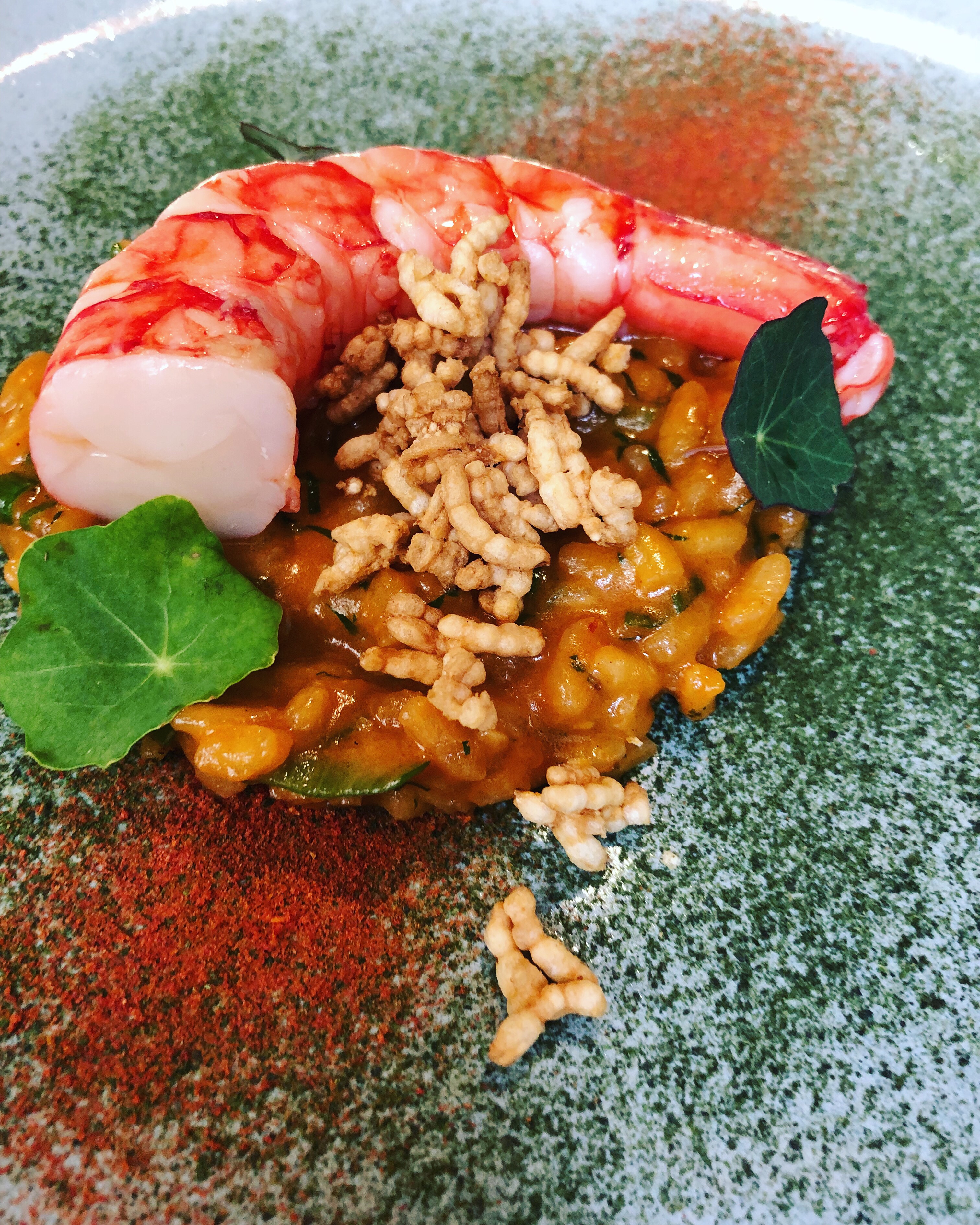 El carabinero es el crustáceo favorito -con el bogavante azul– de los cocineros portugueses. Este es sobresaliente con su dulce puré de calabaza, la punzante harissa, ajo negro y pickles de qumquat, todo delicioso y aromático y con el toque amargo y ácido del qumquat.