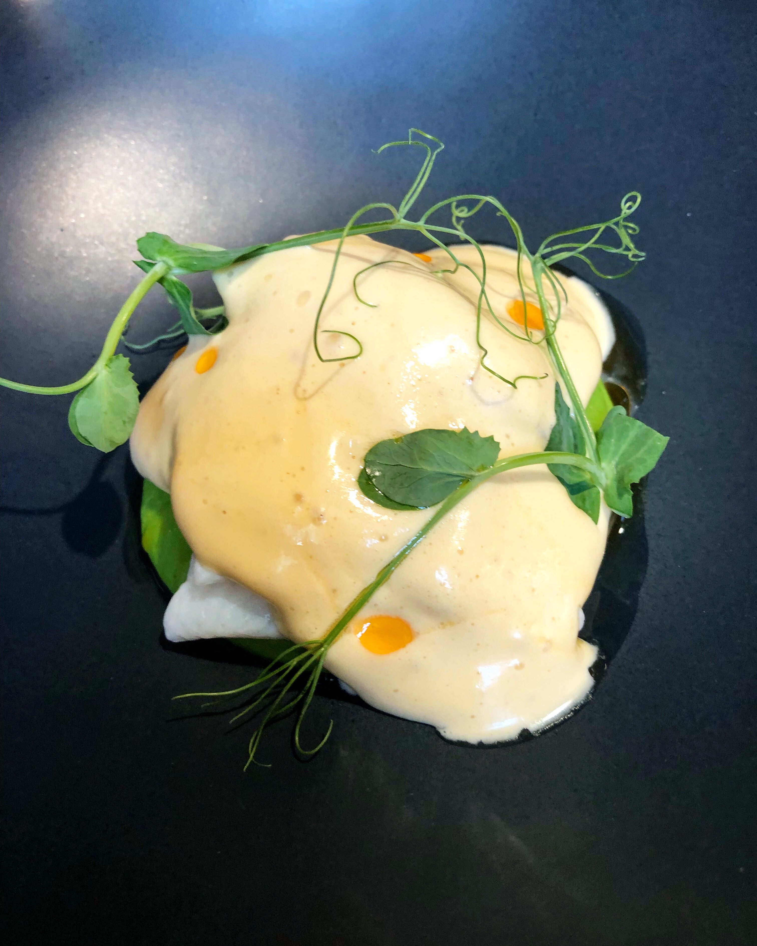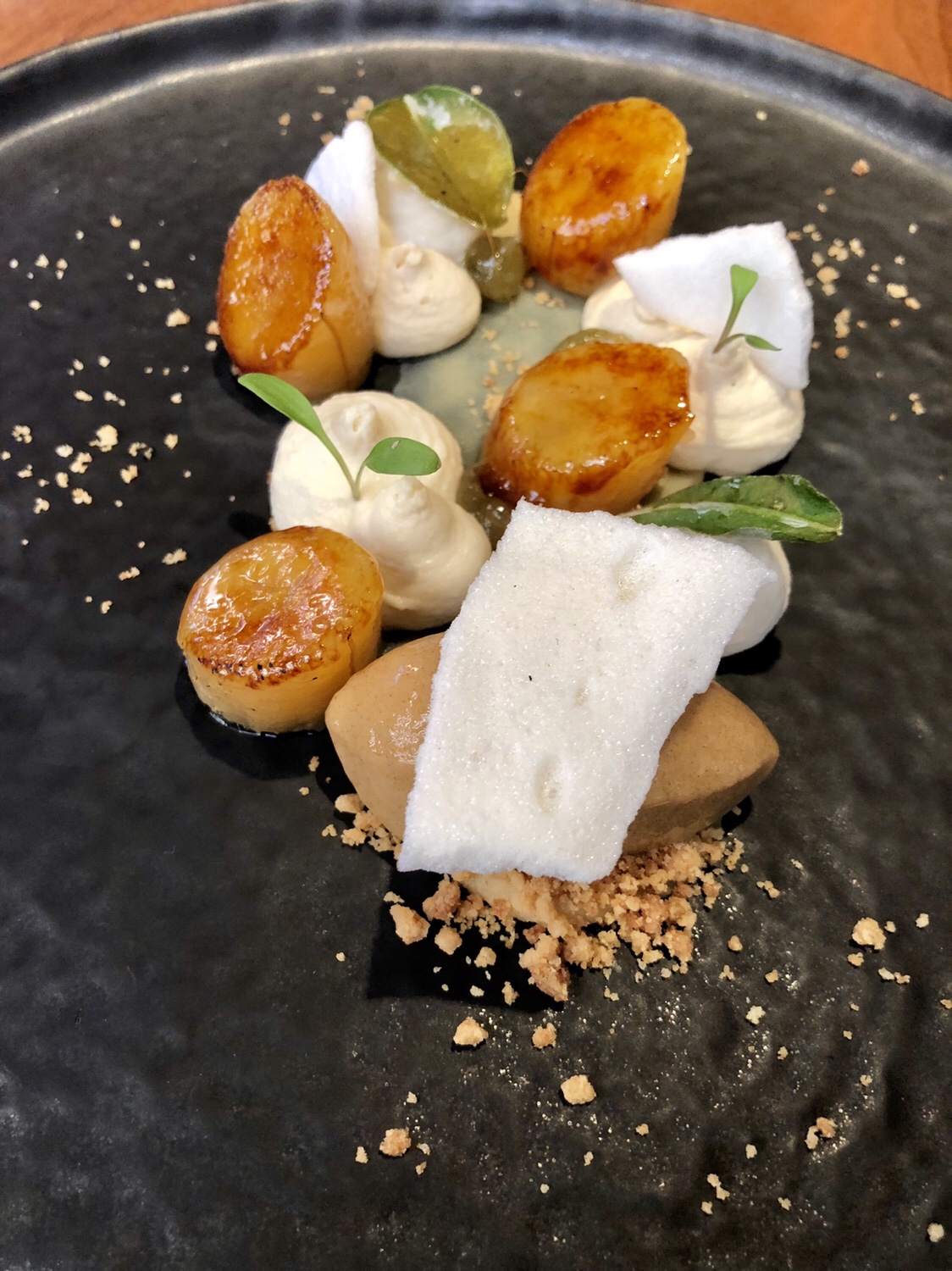Estupenda siempre la merluza de Azores pero aún mejor con texturas de coliflor, seta ostra y todo envuelto en espuma de coliflor con vinagre de manzana y un original crumble de avellanas que combina muy bien con el dulzor de la verdura.