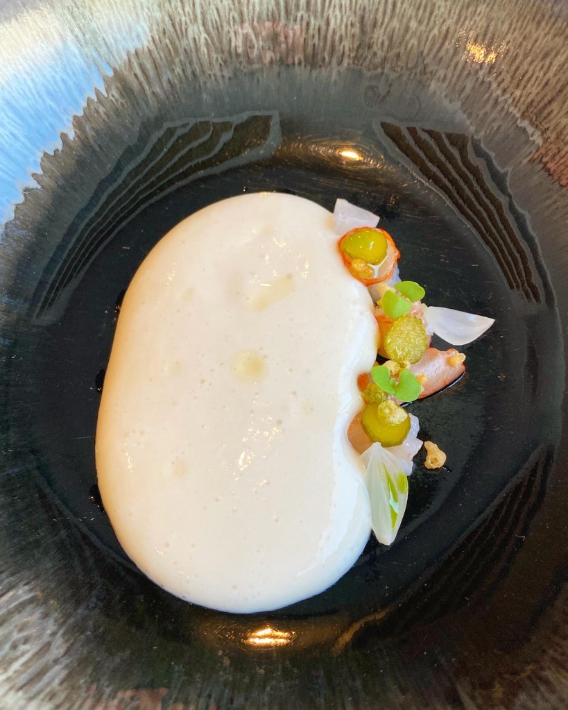 El alistado en crudo con encurtidos y aceite de albahaca son los tropezones, casi un pretexto, para presentar un gazpachuelo de fondo de mejillones que es una etérea espuma llena de sabor y mucho más elegante que la recia receta original. Soy muy poco fan del gazpachuelo y esta versión me ha encantado.