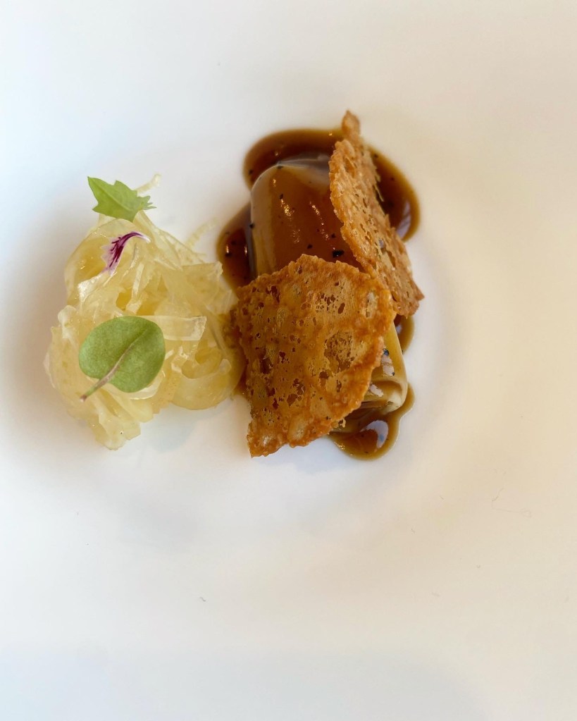 El falso canelón (y es falso porque la pasta es bechamel cuajada) de pato está acompañado y refrescado por un original escabeche de hinojo de sabor muy intenso, pimienta verde y un crujiente de su piel. Densa e j tensa la salsa perfecta para el pato.