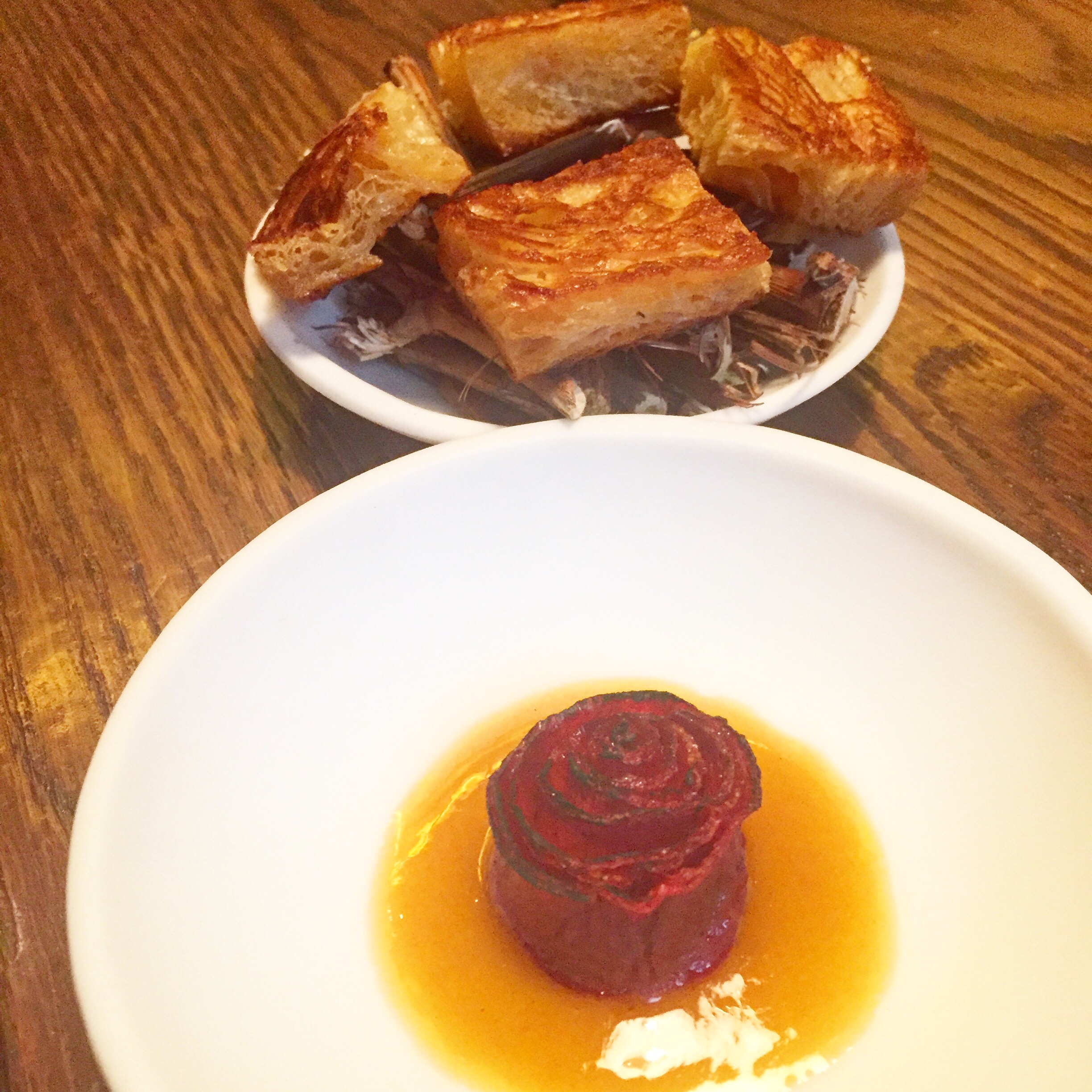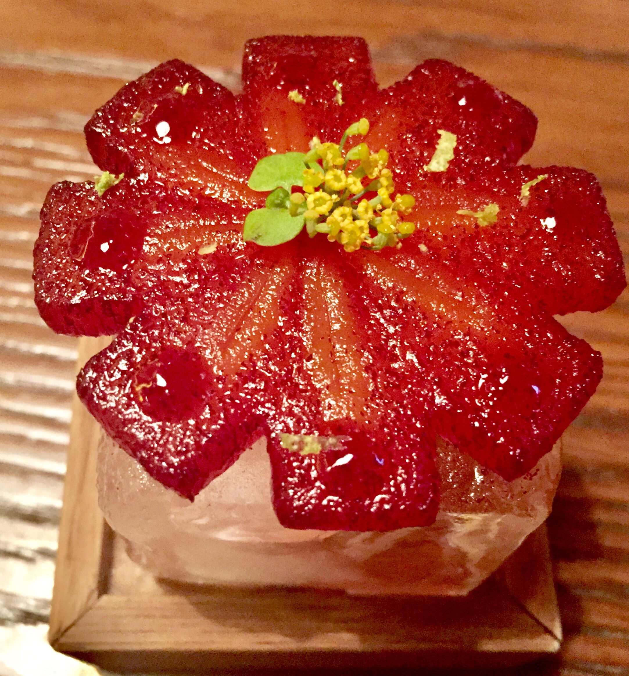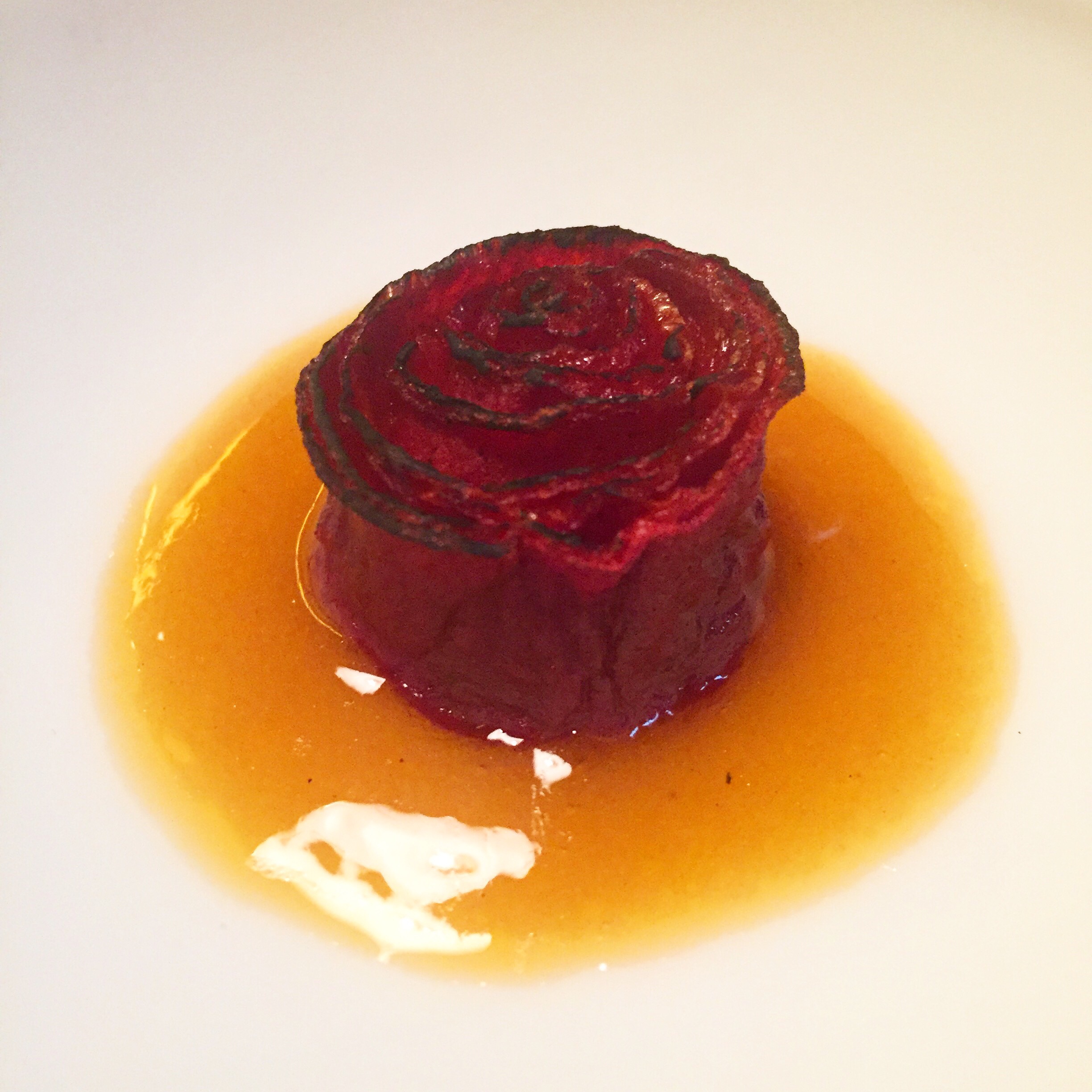 Zanahoria y rosas es un bello cuadro de naranjas y verdes que refresca tras tanta intensidad y muestra una perfecta combinación entre aromas florales y una hortaliza que sólo se llevaba al postre para hacer tartas, cosa incomprensible dado su dulce sabor.
