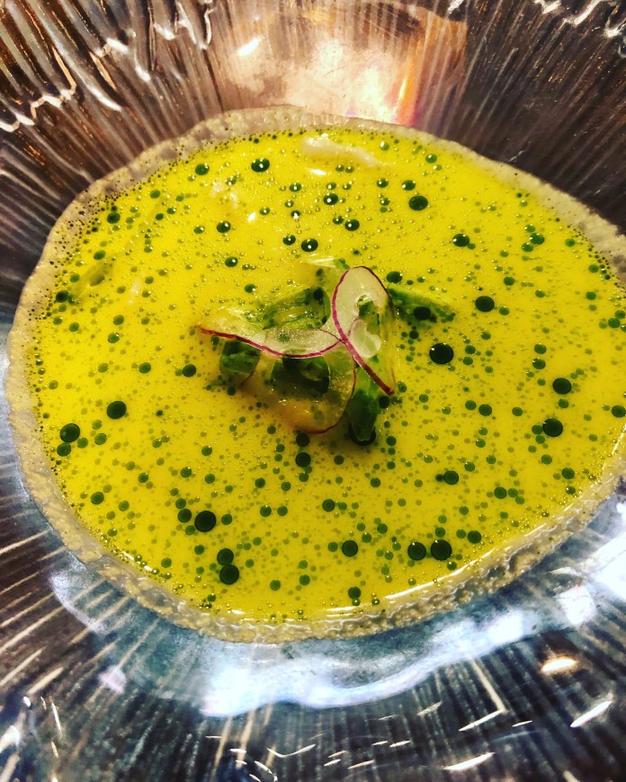 Y hasta aquí las objeciones porque las tripas de bacalao es un plato sobresaliente y por eso hasta les hice un vídeo gastronómicomusical. Se trata de una especie de pilpil revisitado al que se añade un golpe de aceite para que tome un cierto aire de fritura. La gelatinosidad de las tripas se mezcla con sopa y crujiente de tripas, cebolla holandesa crepitante y unos filamentos de ito togarashi. ¿Como se quedan?. Todo el plato es una explosión de sabores excitantes e intensos.
