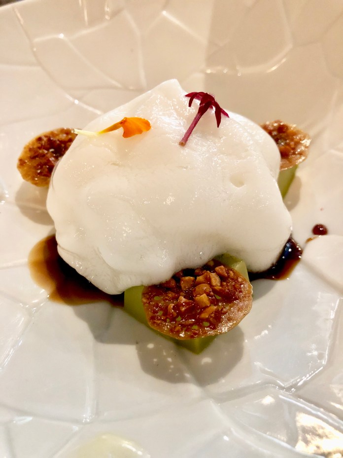 Para hacer un buen menú degustación, no sólo vale trufarlo de buenos platos. El equilibrio entre ellos y un cierto sentido de conjunto es fundamental. Por eso, optar por el frescor después de este festival de sabores intensos es un acierto. La piña, anís y melocotón es una composición fresquísima y llena de frutas sabrosas, que se enriquece con apio y algo de chile, en un juego de texturas y contrastes sumamente logrado.