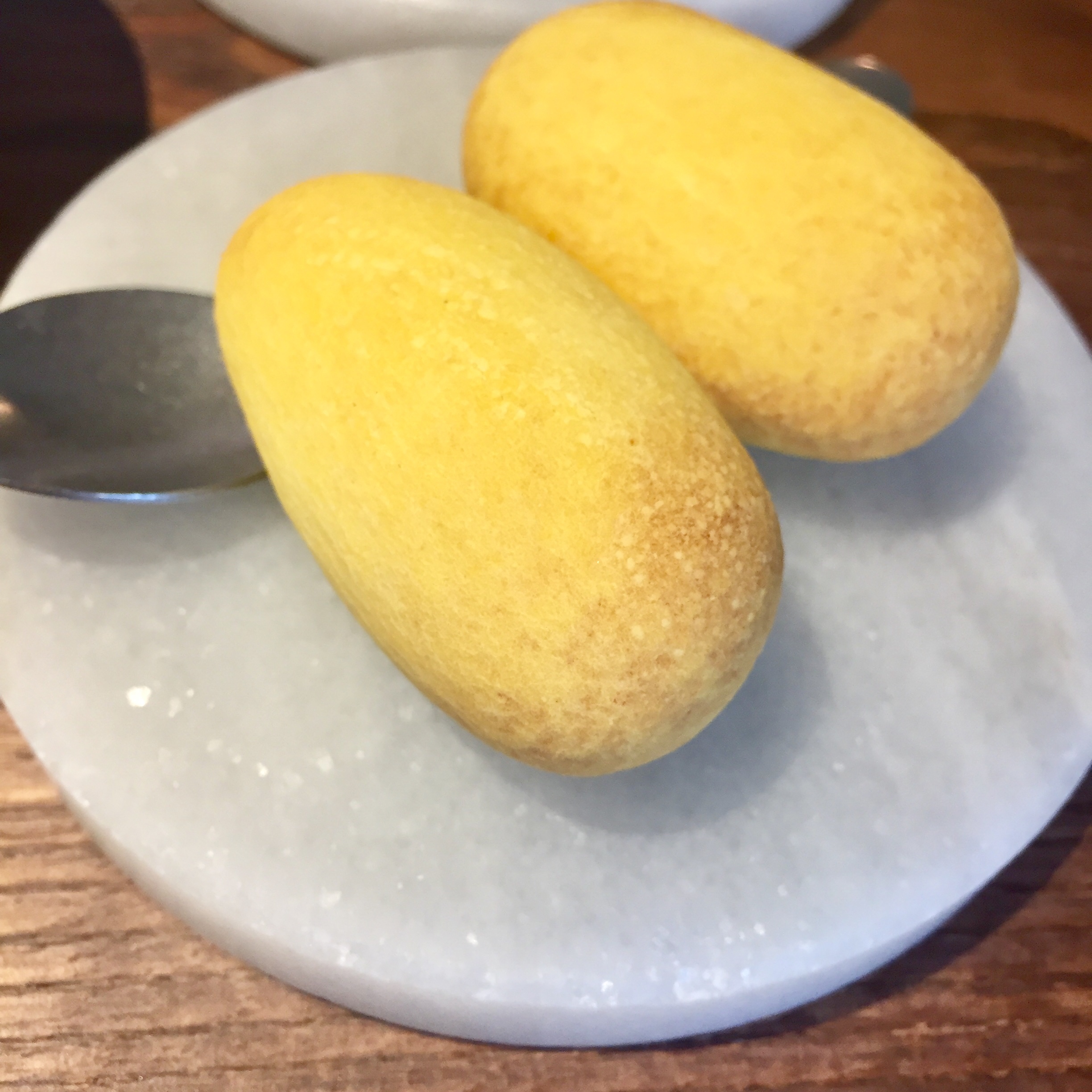Siguen otras dos delicias llenas de sabor y originalidad; una oriental y tierna empanadilla (al vapor) de calamares en su tinta y un buñuelo (líquido por dentro y muy crujiente por fuera) de oreja con (un puntito) salsa brava. Muy de agradecer que de la oreja tenga el sabor pero no la textura cartilaginosa.